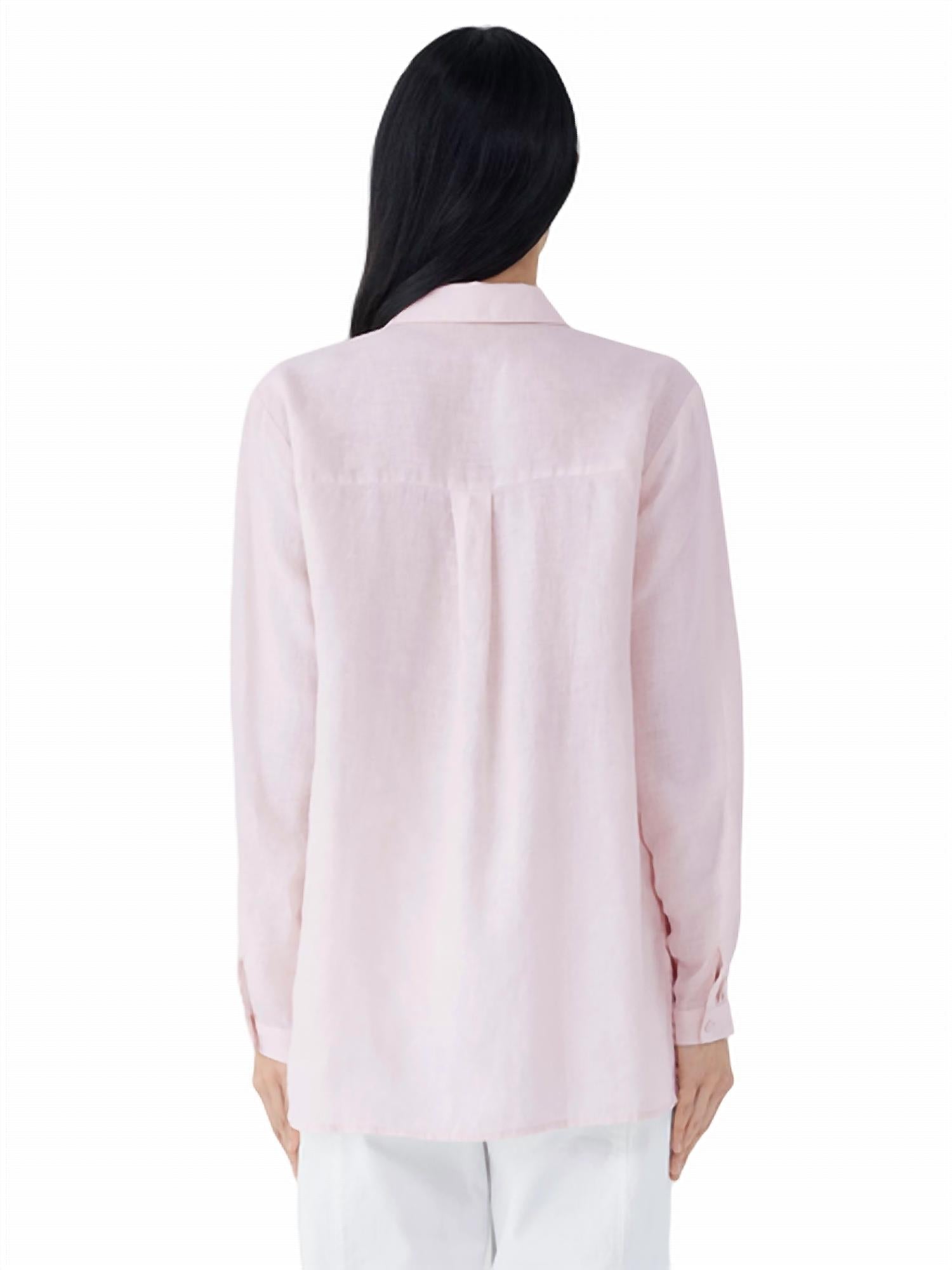 A classic button down shirt that will never go out of style.Classic collar, button front and button cuffs with double pleat. A crisp organic linen staple, updated with an uneven hem. Stepped hem with 5" side slits. Back yoke with center back box pleat. Mother-of-pearl buttons. Machine wash cold. 100% Organic Linen. Made in Indonesia.