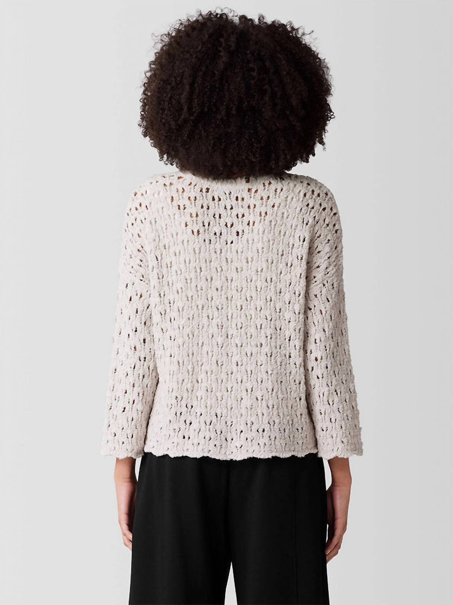 A versatile blouse that works from desk to dinner! Embrace effortless movement with the Cotton Fluff Bracelet Sleeve Top by Eileen Fisher, featuring a generous boxy fit in a textured bone shade. This top includes long bracelet sleeves and a ribbed crew neck, perfect for a stylish and comfortable outfit. Made from a soft cotton blend, the top offers easy pull-on closure and measures 22 inches in size XS, with a 25-inch measurement for size 1X. Care for it is simple with machine wash instructions and lay flat to dry.
