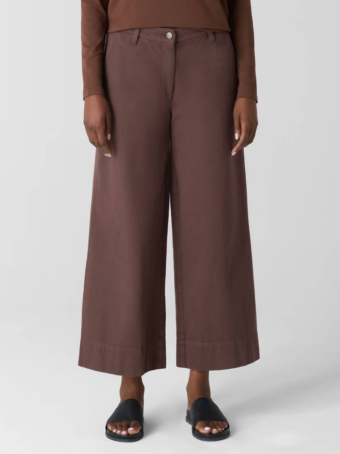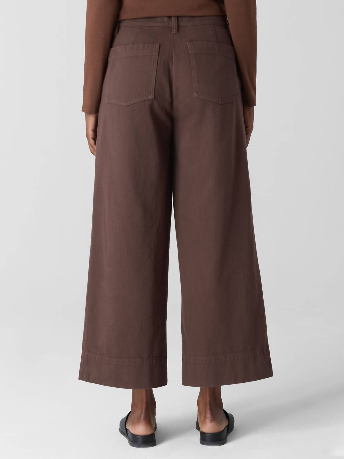 With Eileen Fisher's Garment-dyed Wide-leg Pant, enjoy a classic fit that offers a slim fit through the hips and a wider leg for a chic look. Made from 100% organic cotton, this Biscuit-colored pant features front slash pockets, back patch pockets, and is designed with belt loops and back darts for added shape. Equipped with a fly front featuring a button and zipper closure, these pants embrace the inspired workwear aesthetic with a medium-weight textural weave. Made in Indonesia, they are easy to care for with machine wash cold and tumble dry low instructions.