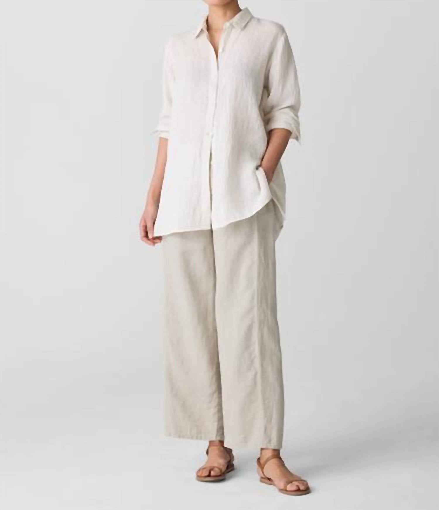 Great fit, cute design, soft fabric. You'll love everything about this long sleeve tee. The classic collar shirt. A crisp staple in organic linen, now in a yarn-dyed stripe. Close at the shoulders, wider at the hem. A silhouette that fits the body with ease. Classic collar, button front and button cuffs with double pleat. Stepped hem with 5-inch side slits. Back yoke with center back box pleat. River shell buttons.