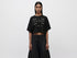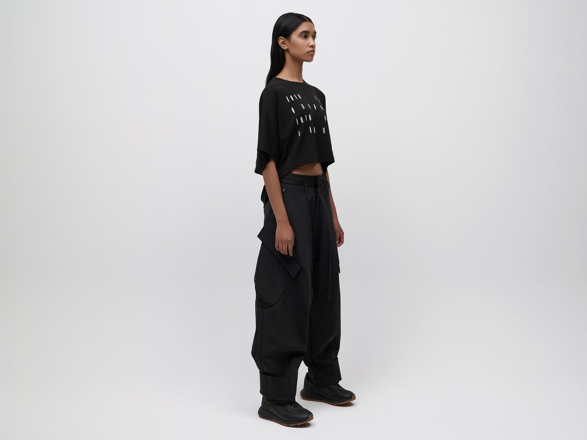 Our Cropped Tee combines fluid dropped sleeves, with a high/low hemline accentuating the neat front with the draped volume in the back. With its waisted front, this effortless crew neck t-shirt is an easy-fit essential crafted from luxurious organic cotton. Our "INTO THE SHADOW" print gives this playful t-shirt a graphic pop that allows for plenty of styling options all year round.