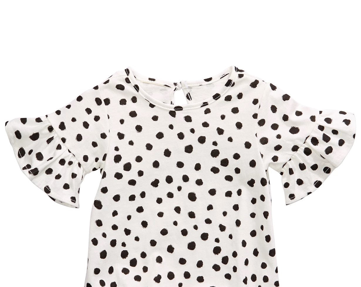 Snap closures at bottom; keyhole at back|Ruffle bell sleeves|All cotton|Machine washable|Imported