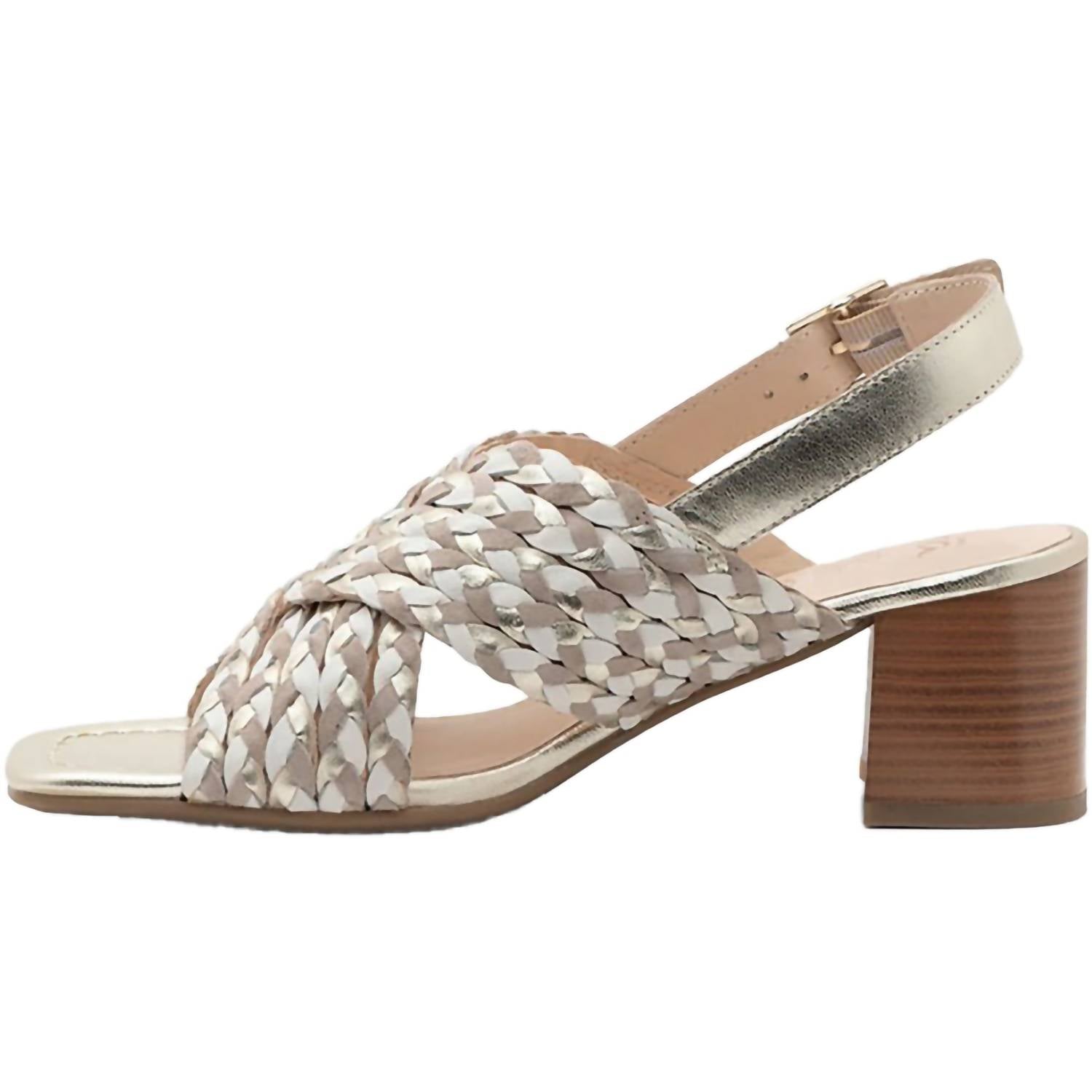 Classicly cute and all-day-wearable. We love this sandal. Step up your summer style with the Women's Benson Sandals by Ara Shoes in a captivating Cream Metallic Multi. These sandals feature a leather upper with woven straps, an open toe, and a block heel, providing both elegance and stability with a heel height of 50mm. The back strap includes a buckle closure for a secure fit, complemented by a leather footbed lining and anti-slip grip sole for comfort and traction. Designed for boho chic vacation vibes, these versatile sandals will effortlessly elevate any seasonal outfit.