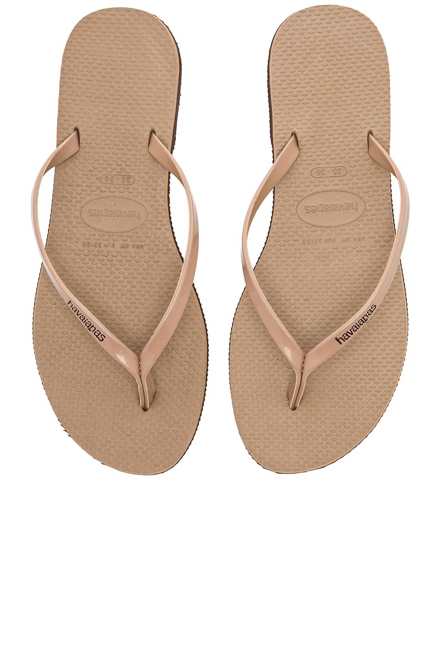 Classicly cute and all-day-wearable. We love this sandal. Step into summer with the Women's You Metallic Sandal by Havaianas, perfect for every occasion from the beach to the city. These Rose Gold flip flops feature an open toe and slip-on design, with laminated vegan leather straps showcasing a sleek metallic finish. Constructed from flexible premium Brazilian rubber with a Havaianas rubber logo and signature textured footbed, these sandals offer both style and comfort. Made in Brazil, they ensure you're vacation-ready with flat heels for easy wear.