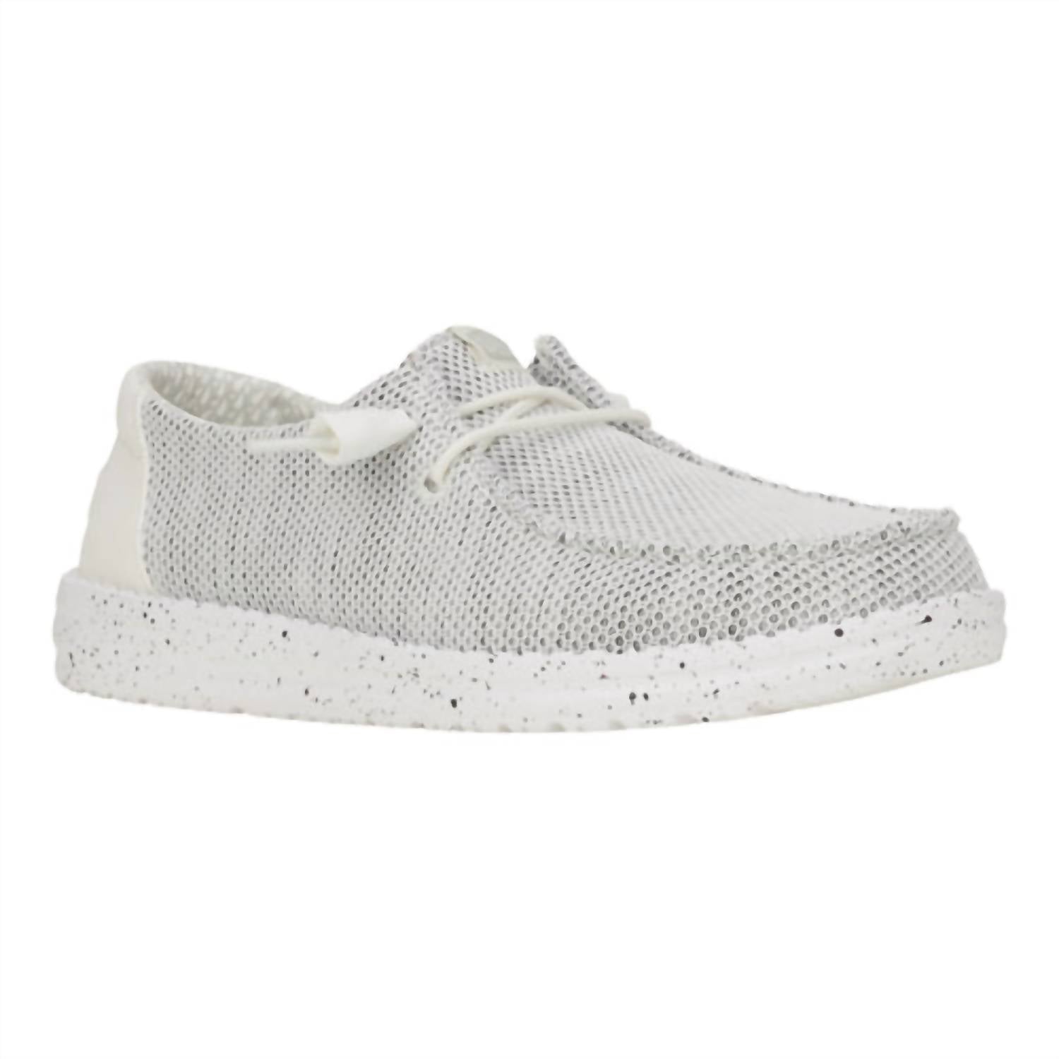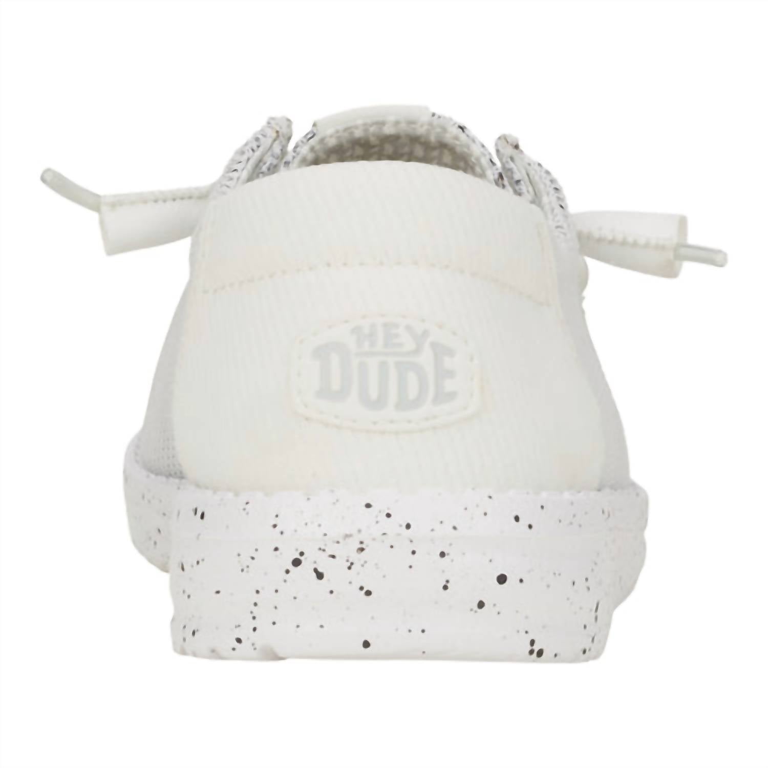 Experience the unparalleled comfort of the Women's Wendy Sox Shoes by HEY DUDE, your new vacation essential. Crafted in a stretch-polyester blend upper with a contrasting heel detail, and featuring a stretch-cotton lining, these stone white loafers offer a minimalist design without sacrificing support. The Easy-On system with no-tie elastic laces and Flex & Fold Technology ensures convenience, while the ultralight outsole and removable leather-lined insole provide lightweight comfort. These shoes are easy to wash and air dry, perfect for an effortless, breezy spring look.