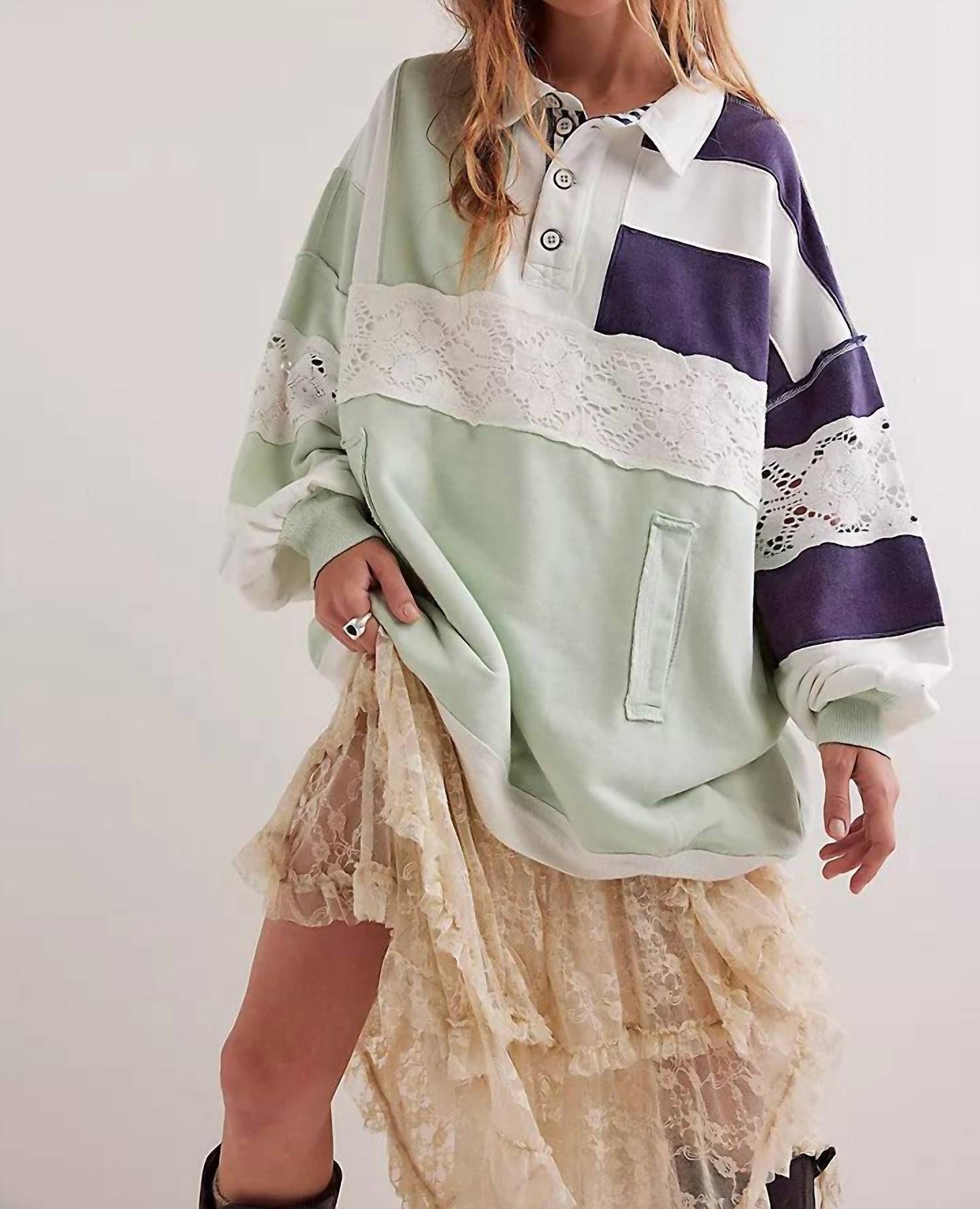 Introducing the American Dream Polo by Free People, a distinctive nautical combo piece perfect for layering with flair. This women's long-sleeve polo boasts a comfortable oversized fit with drop-shoulder sleeves adorned with contrast lace detailing and elasticated cuffs. Crafted from 100% cotton, it measures 53 inches at the bust and 30.25 inches in length. Closure: Button closure. Care: Machine wash cold, hang dry. Featuring a classic collared neckline, ribbed hems, and convenient hand-pocket detailing, this polo offers an unexpected touch to any outfit.