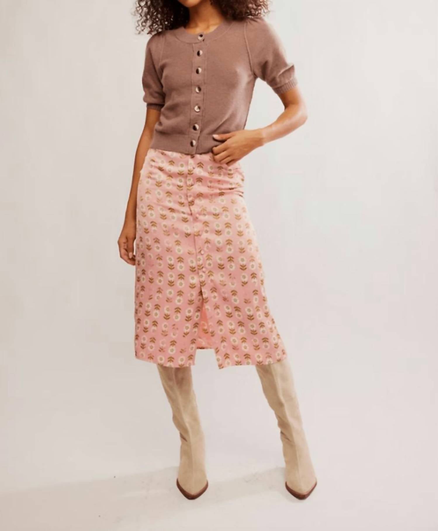 Show off just the right amount of skin in this beautifuly designed midi length skirt. Elevate your wardrobe with the Analise Printed Midi Skirt by Free People, showcasing a vibrant floral print in a captivating pink hue. Crafted from cotton, this skirt promises comfort and a chic flowy silhouette that's ideal for any fashionable occasion. Closure: Button closure. This piece is a perfect addition for women who appreciate elegance and style.