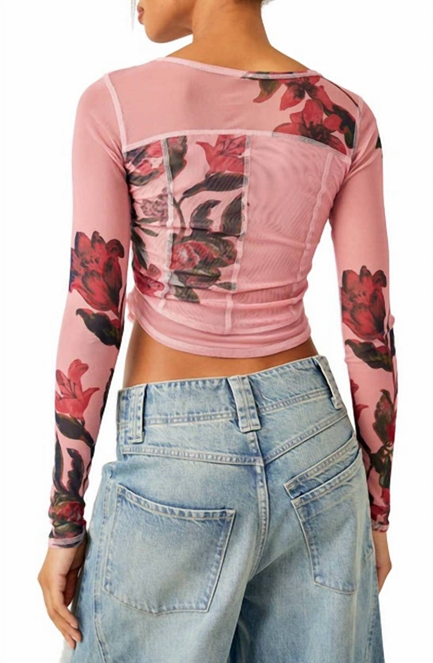 Show a little skin in this cute and casual crop top. Crafted with a polyamide composition for a delightful finish. Pink combo design boasts long semi-sheer sleeves and a flattering fitted silhouette supported by defined seaming. With its pull-on closure and classic boat neckline. Offers ease and elegance, adorned with timeless floral patterns. Garment length is 21.5 inches. Hand wash cold.