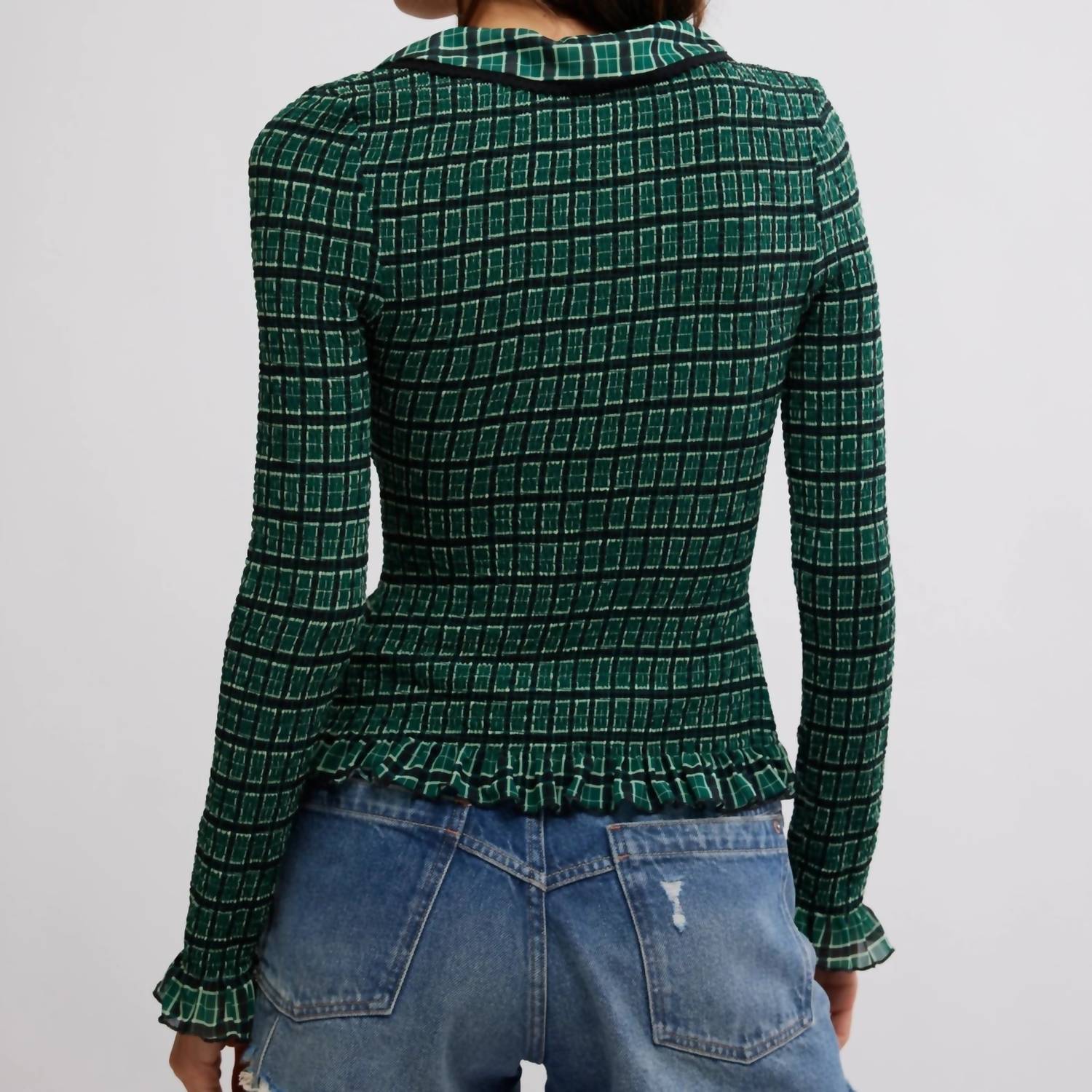 Throw this adorable cardigan over any cami or tank top. Introducing the Caught A Feeling Cardigan by Free People, a chic green combo piece that elevates the classic cardigan silhouette with a playful plaid and check design. This hip-length, slim-fit top showcases a smocked nylon blend fabric with a collared neckline, fitted long sleeves, and a stylish lettuce-edge trim. Closure: Button front closures. Care: Machine wash. A delightful addition to any outfit, perfect for adding a printed touch to your wardrobe.