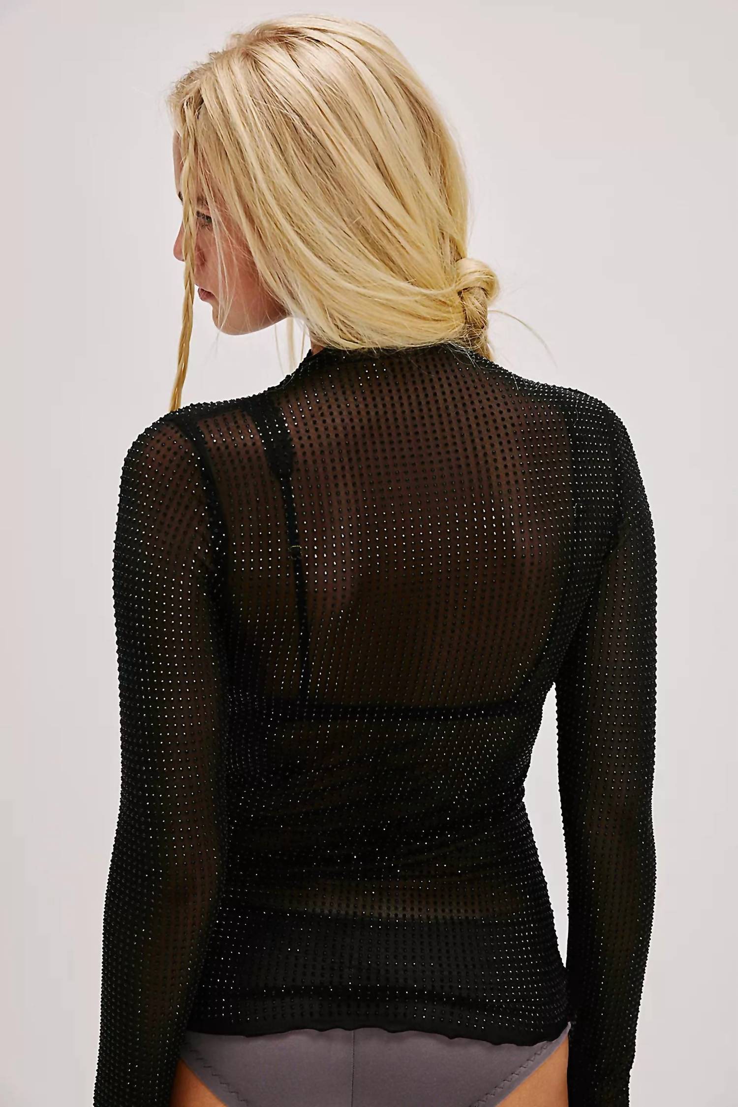 Radiate in the Dance All Night Longsleeve Top by Free People, featuring a luxe embellishment that dazzles under the lights. This black, form-fitting blouse is crafted from 95% Polyester and 5% Spandex, offering a chic sheer mesh design with long fitted sleeves complete with thumb holes. Adorned with sparkling rhinestones, it flaunts a modern mock neckline and elegant lettuce-edge trim. Care instructions include hand washing cold and laying flat to dry.