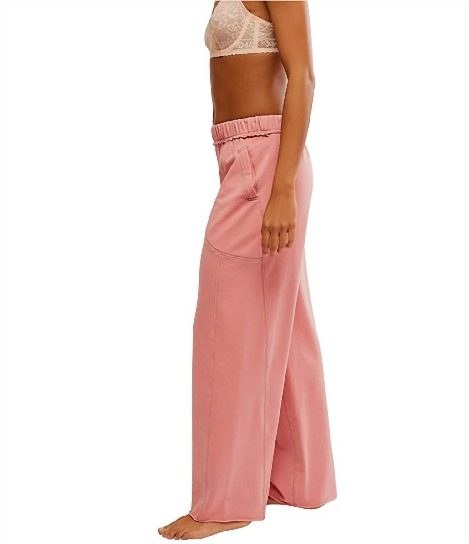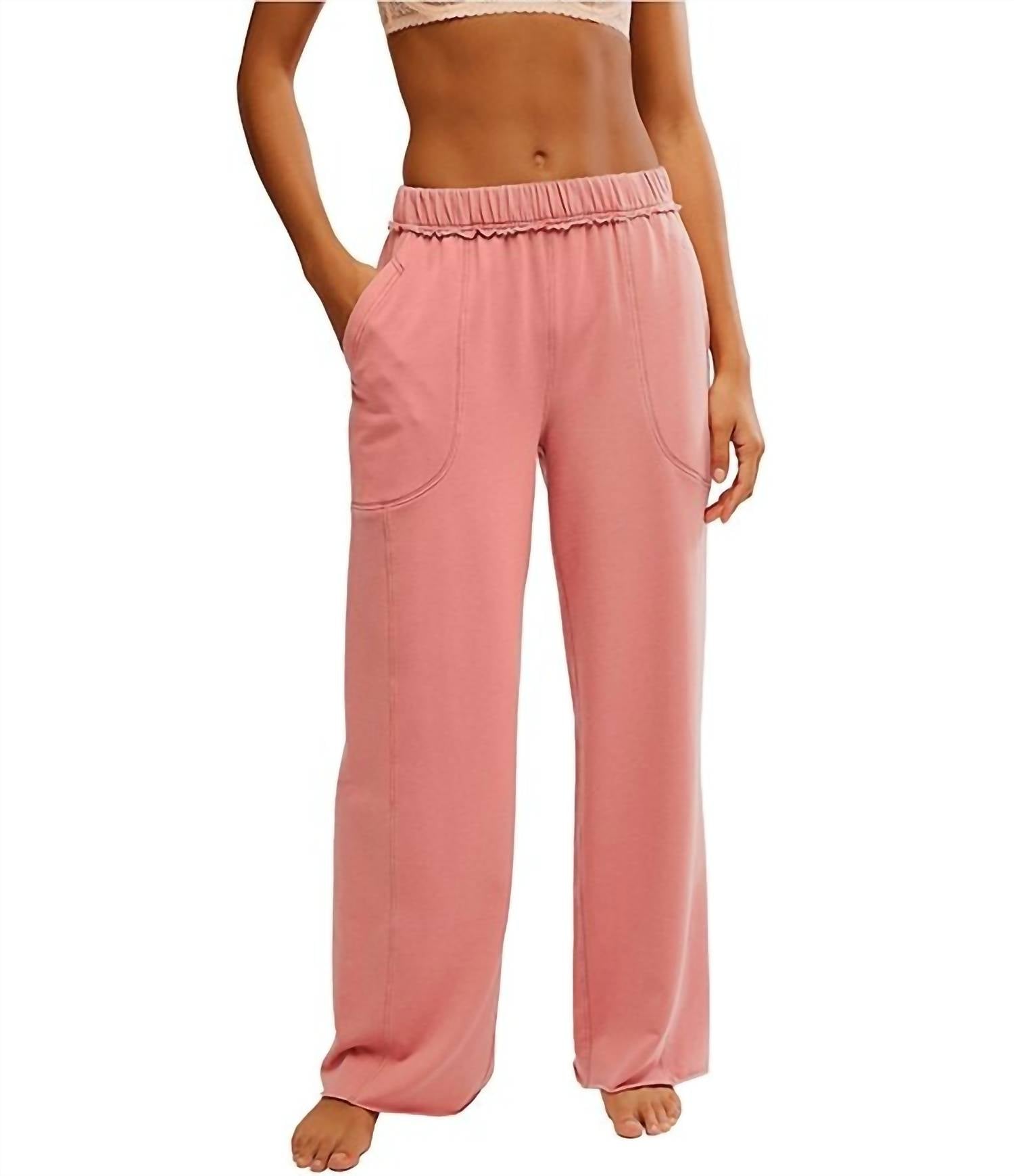 Introducing the Free People Don't Wait Up Lounge Pant in Rose Dawn, a perfect blend of comfort and style. With a relaxed fit and pull-on closure, these wide-leg lounge pants are crafted from a soft cotton blend—48% cotton, 48% polyester, and 4% elastane—to ensure you stay cozy and chic. They include practical pockets and feature a low-rise waist with a solid pattern, ideal for both lounging at home and casual outings. Care instructions are simple: machine wash cold, tumble dry low, and low iron when needed. Dry cleaning is also an option. Model Maci is wearing a size small.