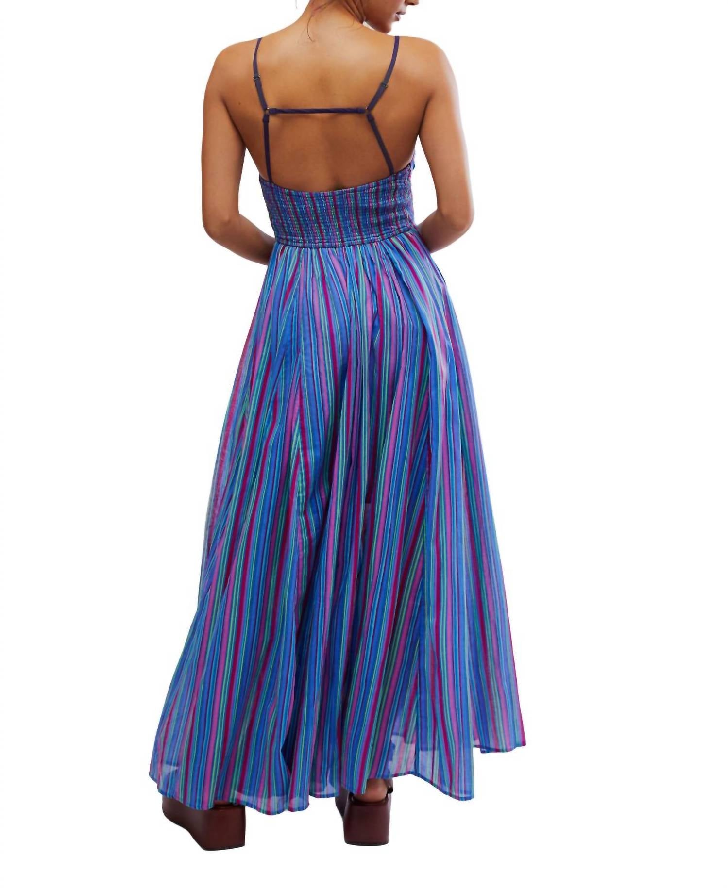 This billowy maxi dress features a soft fabrication and a colorful striped design. It has a sweetheart neckline with adjustable ties at the center front, thin adjustable shoulder straps, and a bold open-back detail with a smocked band. Made from 100% cotton with a lining of 100% rayon. Machine wash cold. For size small, the waist measures 27 inches, and the length is 50 inches. Imported.