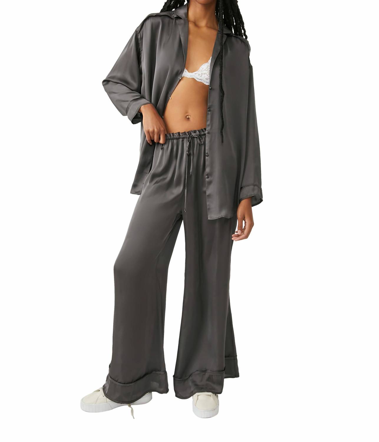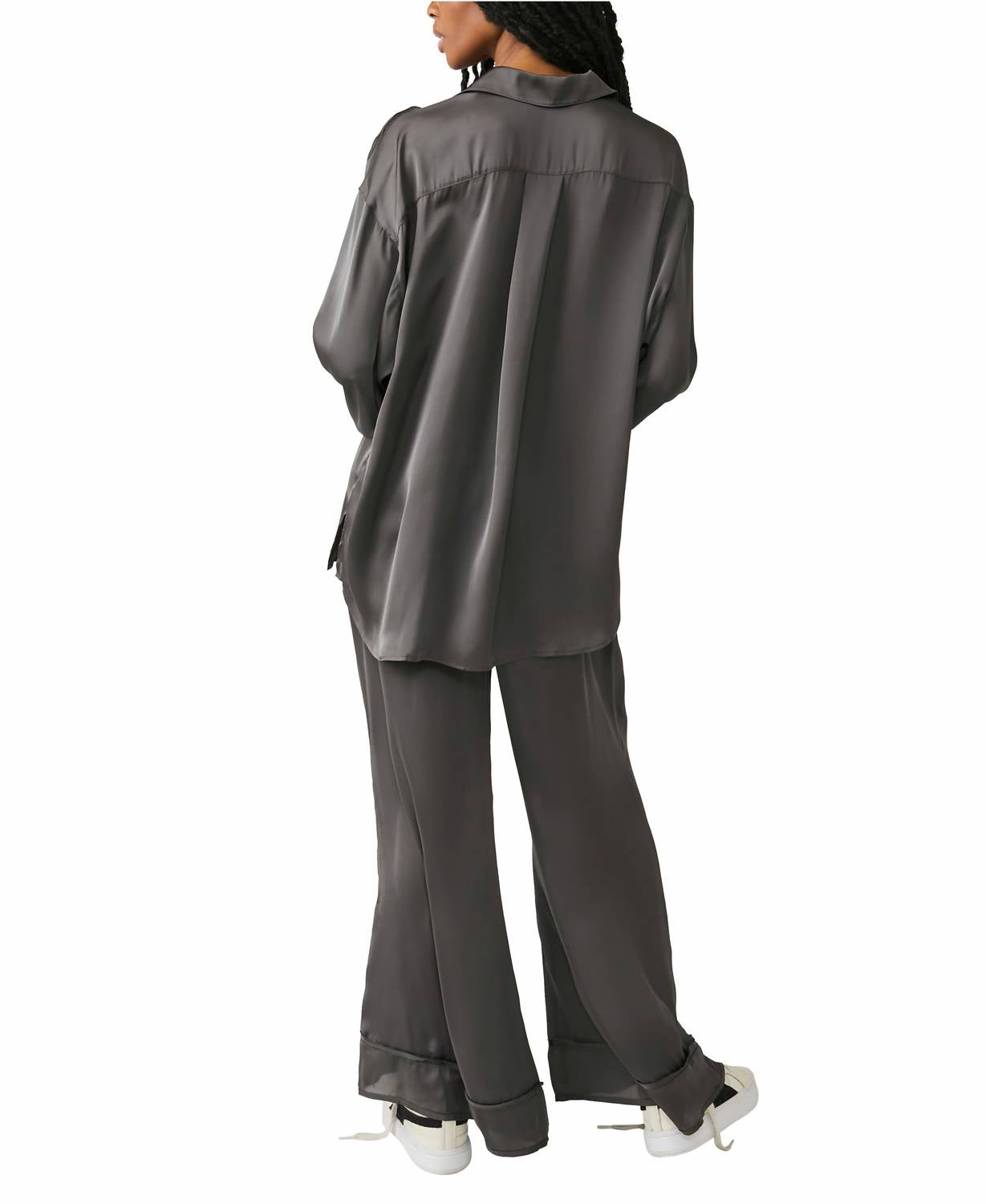 Works well with naps, zoom calls and binging your favorite series. Discover ultimate comfort with the Dreamy Days Pajama Set by Free People, crafted in a chic washed black solid print. This women's set includes a long-sleeve top with a convenient button-front closure and matching wide-leg bottoms. The lightweight and breathable fabric ensures year-round coziness, while the elastic waistband with an adjustable drawstring promises a perfect fit. Care for this essential piece by hand washing and line drying.