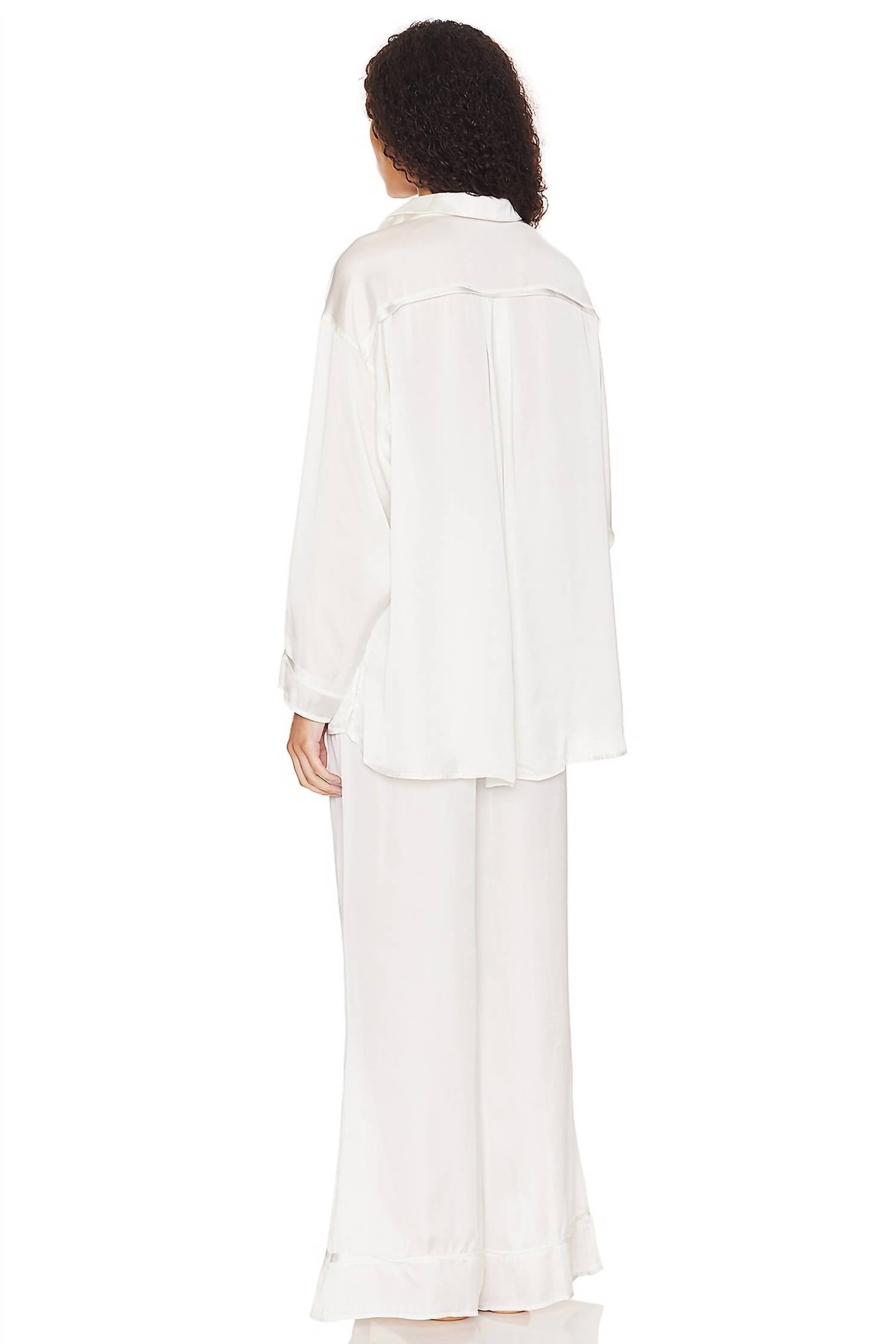 A set so cute you'll never want to take it off. Designed to look good while lounging, this little number is the perfect outfit for hanging at home in style. Elevate your loungewear with the Dreamy Days Solid Pajama Set by Free People, crafted in luxurious satin ivory. This set is made from 100% polyester in China, featuring a front button closure with button cuffs for a tailored fit. The drawstring waist tie allows for an adjustable and comfortable wear. Care: Hand wash for longevity and softness.
