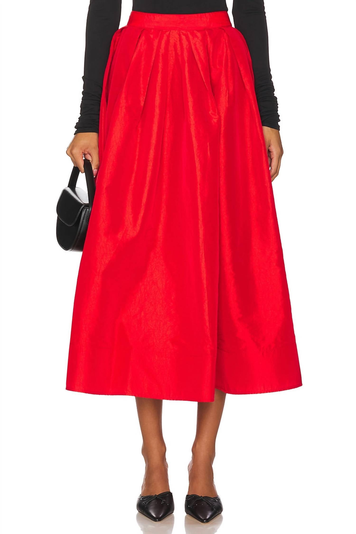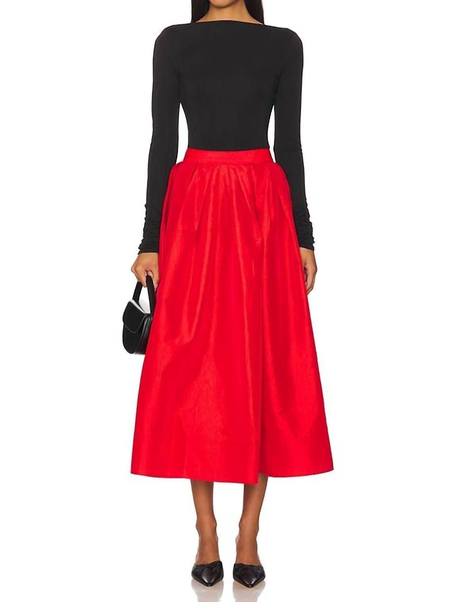 Tuck your favorite tee into this midi length skirt for an effortlessly cool look. Discover the Emilia Full Skirt by Free People, a bold statement piece in High Risk Red that captures attention. With a length of 34 inches, this skirt combines 50% nylon and 50% polyester for a durable yet elegant finish. Made in Cambodia, it features a hidden back zip closure and lightly pleated details. Care for this skirt by opting for dry cleaning to maintain its vibrant appeal.