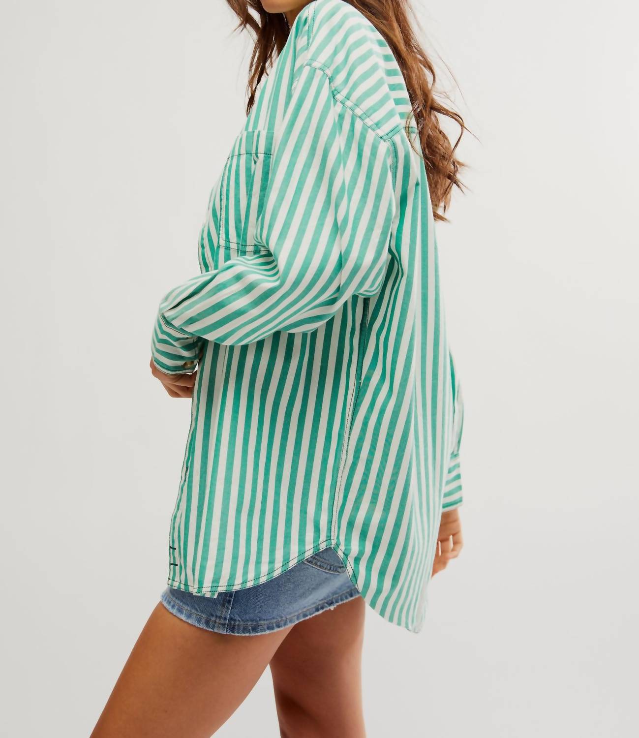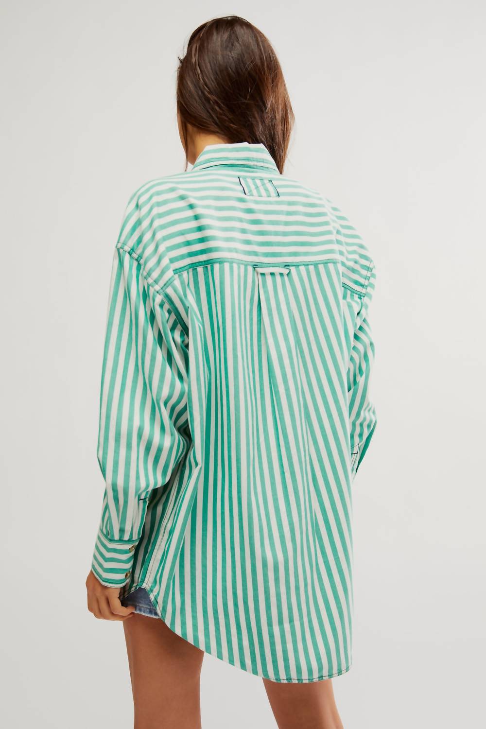 This button down shirt is comfortable yet polished. The Freddie Shirt by Free People is a must-have for any wardrobe, offering a chic French Green Combo with a stylish stripe pattern. This button-down shirt is crafted from 100% cotton, featuring long sleeves with cuffs, a collared neckline, and a convenient chest pocket. Designed for a slouchy and oversized fit, it has a dropped shoulder and a shirttail hem for added style. Button closure. Machine wash, tumble dry.