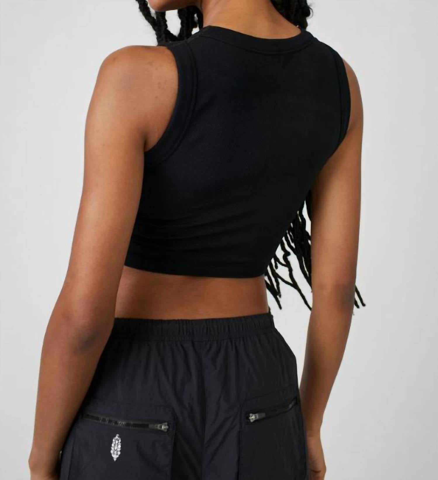 Introducing the Free Throw Muscle Tank Top by Free People, a chic addition to your compressive collection in classic black. This sleeveless top features a muscle-style silhouette with a stretchy, ribbed knit texture and a slight scoop neckline, perfect for layering. Originating from imported materials, it offers a cropped, pull-on style for easy wear. Care for this piece with a machine wash in cold water.