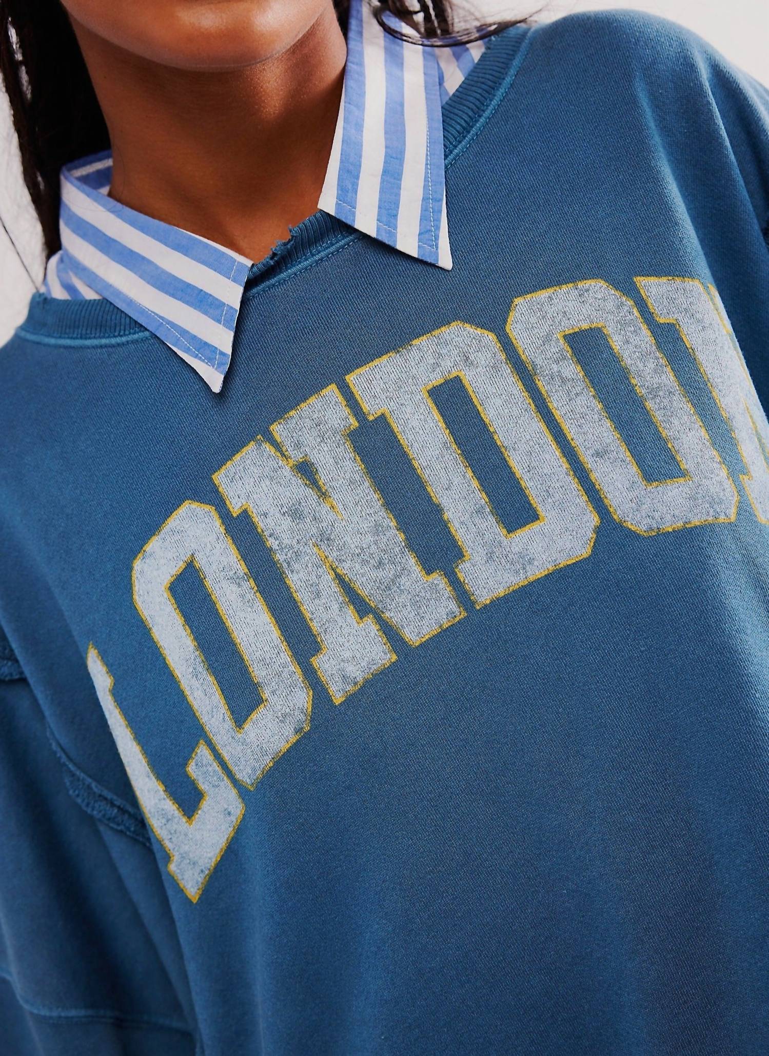 Elevate your casual wear with the Graphic Camden Sweatshirt by Free People, available in a trendy Navy London Combo. This long sleeve tee offers a slouchy, relaxed fit complete with a scoop neckline, dropped shoulders, and varsity-inspired graphic for a vintage flair. Composed of a cotton blend, the material mix includes 51% Cotton and 49% Polyester with ribbing made entirely of cotton. The sweatshirt features a pull-on closure and is easy to care for, requiring only a machine wash.