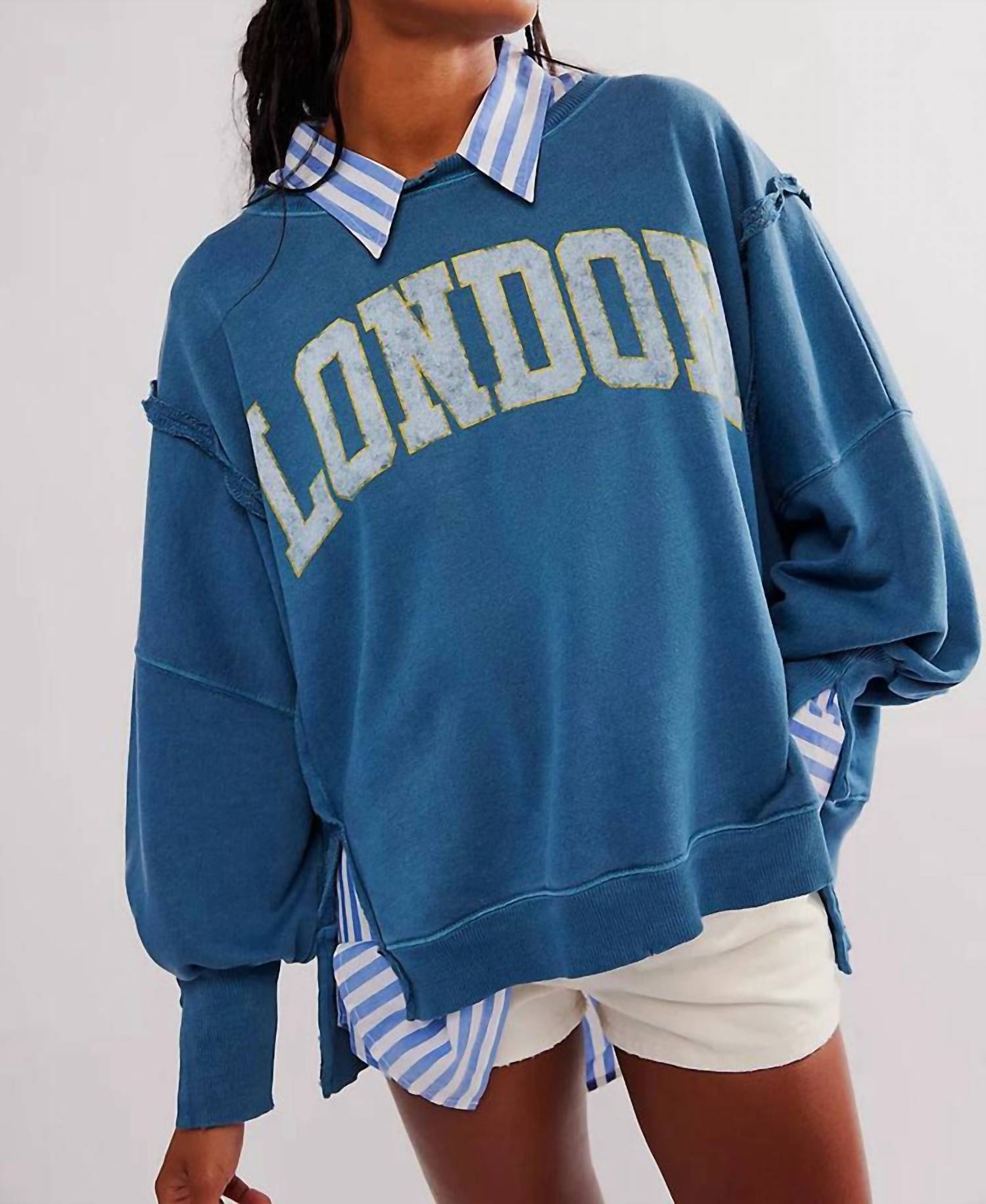 Cozy fabric, impeccable design - Meet the sweatshirt that you'll never want to take off. Elevate your casual wear with the Graphic Camden Sweatshirt by Free People, available in a trendy Navy London Combo. This long sleeve tee offers a slouchy, relaxed fit complete with a scoop neckline, dropped shoulders, and varsity-inspired graphic for a vintage flair. Composed of a cotton blend, the material mix includes 51% Cotton and 49% Polyester with ribbing made entirely of cotton. The sweatshirt features a pull-on closure and is easy to care for, requiring only a machine wash.