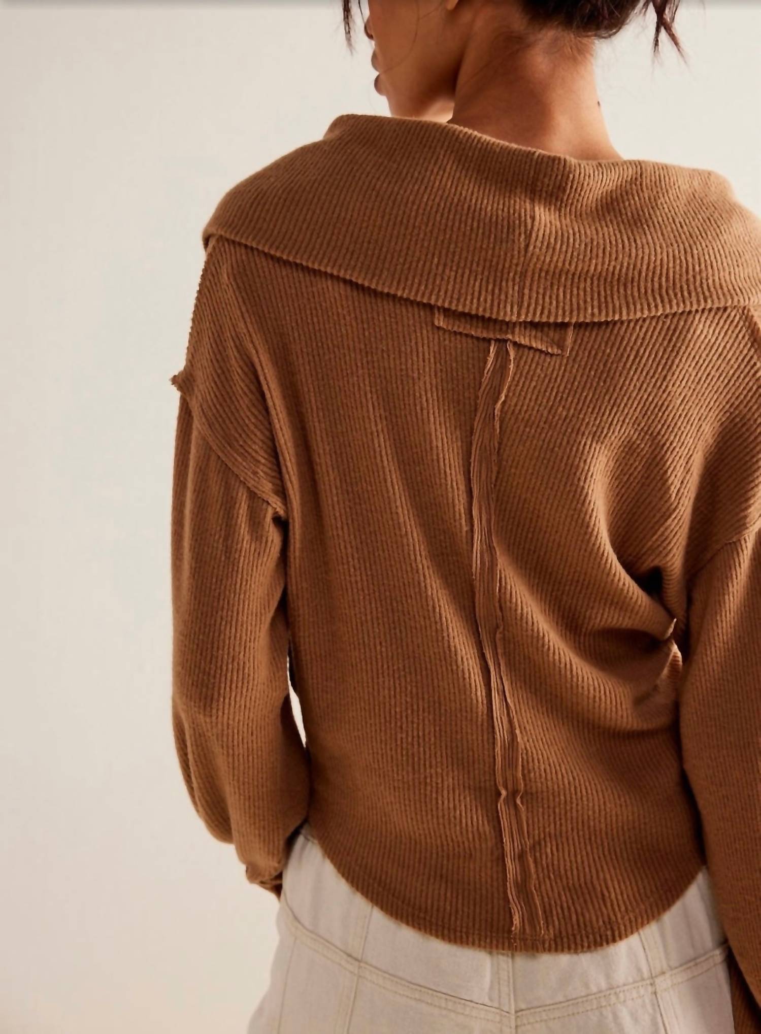 Wear this v-neck sweater with your favorite denim for the perfect fall look. Introducing the Hold Me Close Pullover by Free People, a timeless addition to any wardrobe in a rich brown hue. This women's V-neck top offers a drapey, relaxed fit with long sleeves and a stylish wrap-front detail. Crafted from a textured viscose blend, it features a ribbed knit fabrication with a rounded bottom hem and exposed seaming. Care is uncomplicated with a machine wash in cold water, and the pullover style makes it an easy choice for versatile wear.