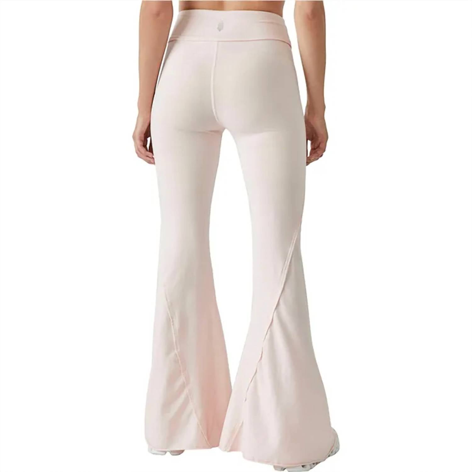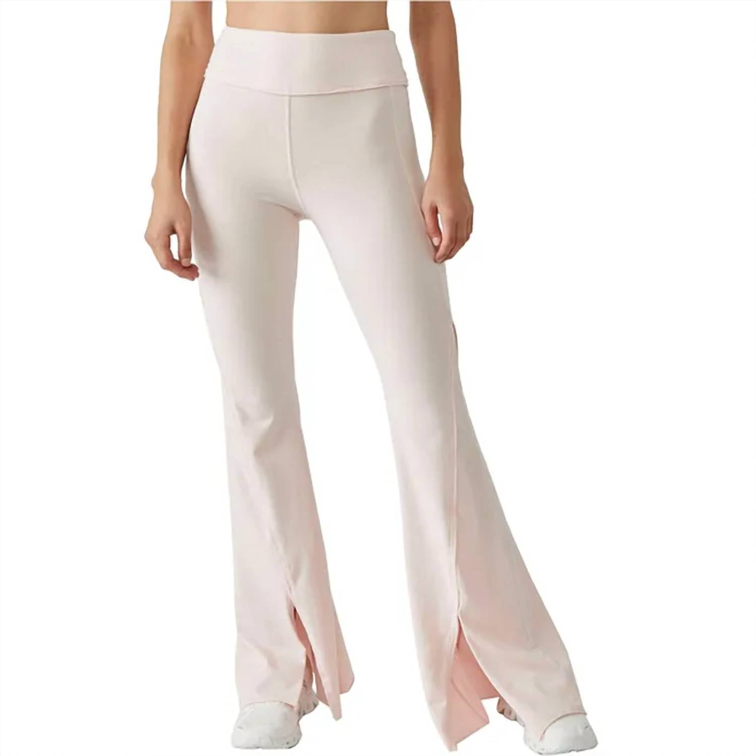 Delightful Touch Of Pink high-rise pants. Boast a soft cotton composition and feature a stylish flared leg with front slit details, offering both comfort and a flattering fit. Pull-on style ensures ease and convenience. Stretchy fit makes them perfect for lounging or a casual day out. Machine wash for easy maintenance.