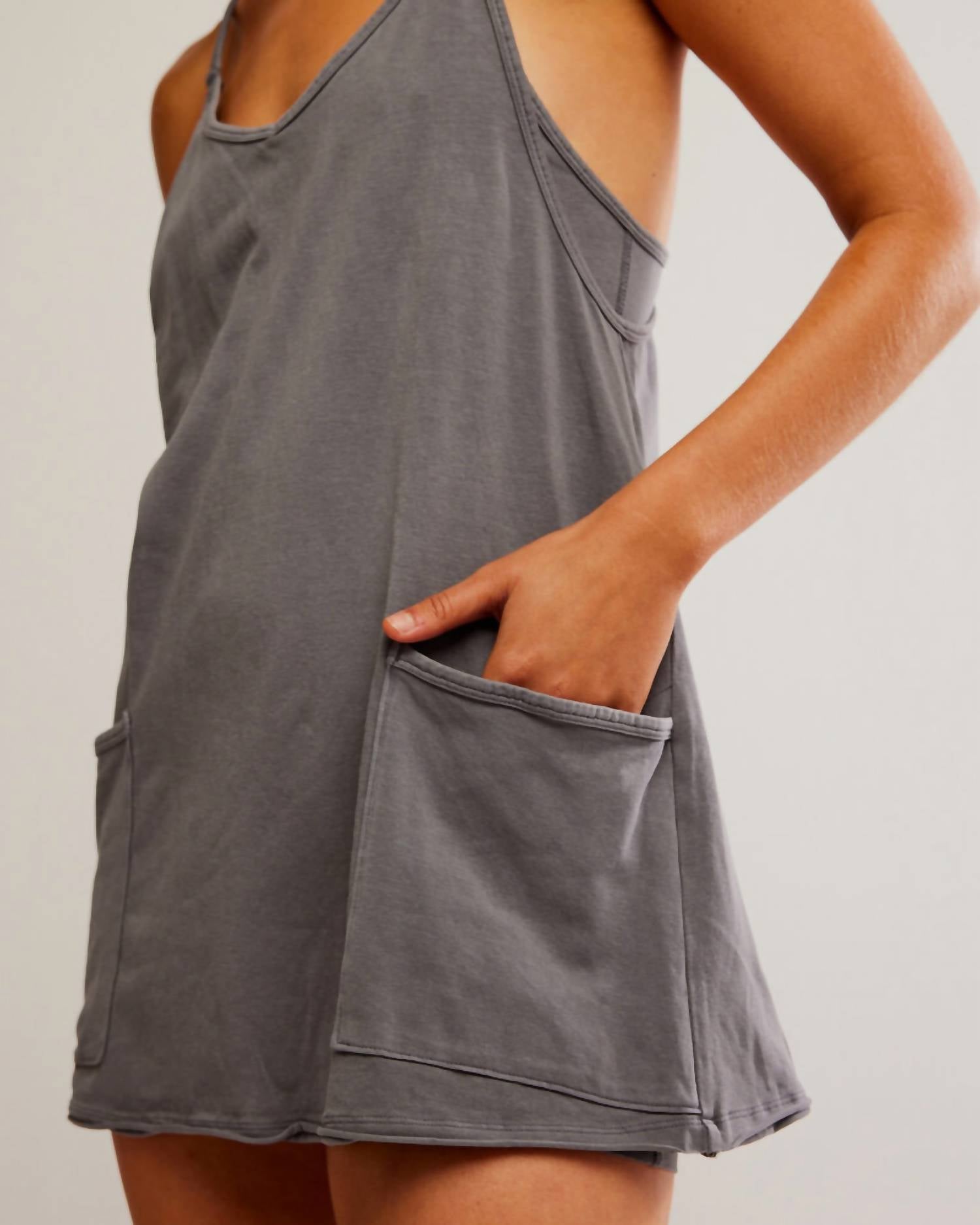 The kind of easy and flattering dress you'll be reaching for all season long. Introducing the Free People Hot Shot Mini in a chic Gun Metal Grey, designed for the stylishly active woman. Featuring spaghetti straps and a flattering A-line silhouette, this mini-length dress is crafted from a soft 95% Cotton and 5% Spandex blend. Equipped with oversized patch pockets and built-in shorts for added convenience, it also includes a discreet small zip pocket at the back. With a pull-on closure, this solid pattern dress can be machine washed cold for easy care.
