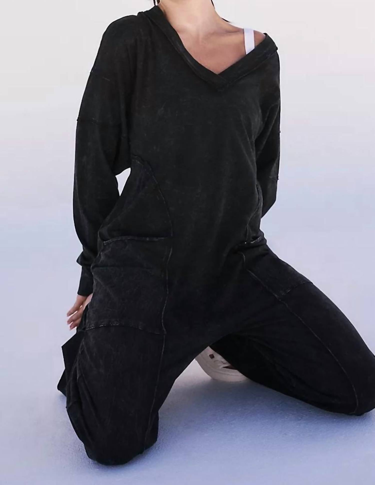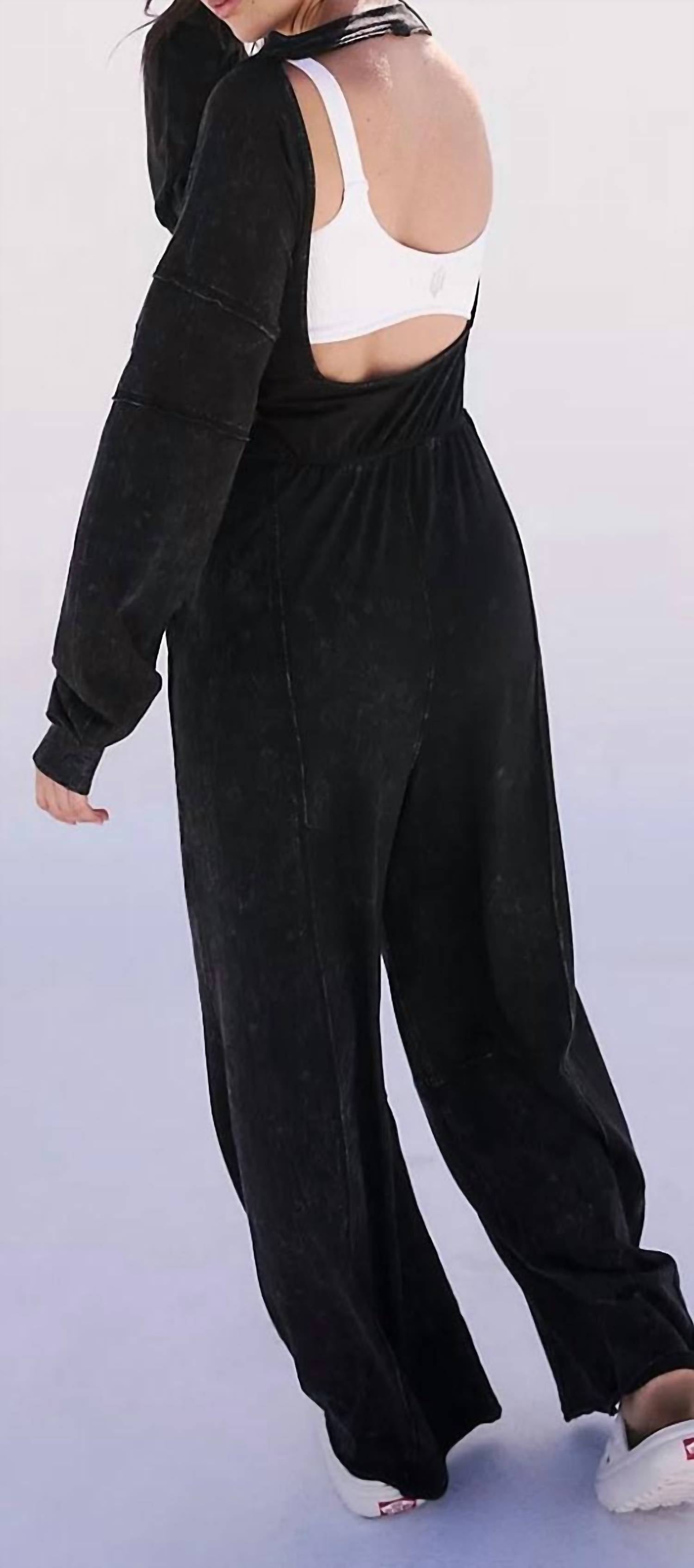 It doesn't take much for this one piece to look effortlessly cool. Add some statement jewelry to dress it up, or throw on some sneakers for a more casual vibe. Introducing the Hot Shot Runner One Piece by Free People, a stylish blend of comfort and flair from the Hot Shot collection. This women's jumpsuit in classic black features long drop-shoulder sleeves with cinched cuffs and a striking open-back detail. Crafted from a soft cotton blend for a slouchy, relaxed fit, it boasts wide full-length legs and oversized patch pockets for added convenience. Closure: Pull on. Care: Machine wash cold. Measurements for size small: 35" bust, 34" waist, 43" hips, 22.75" sleeve, 21" rise, 28" inseam.