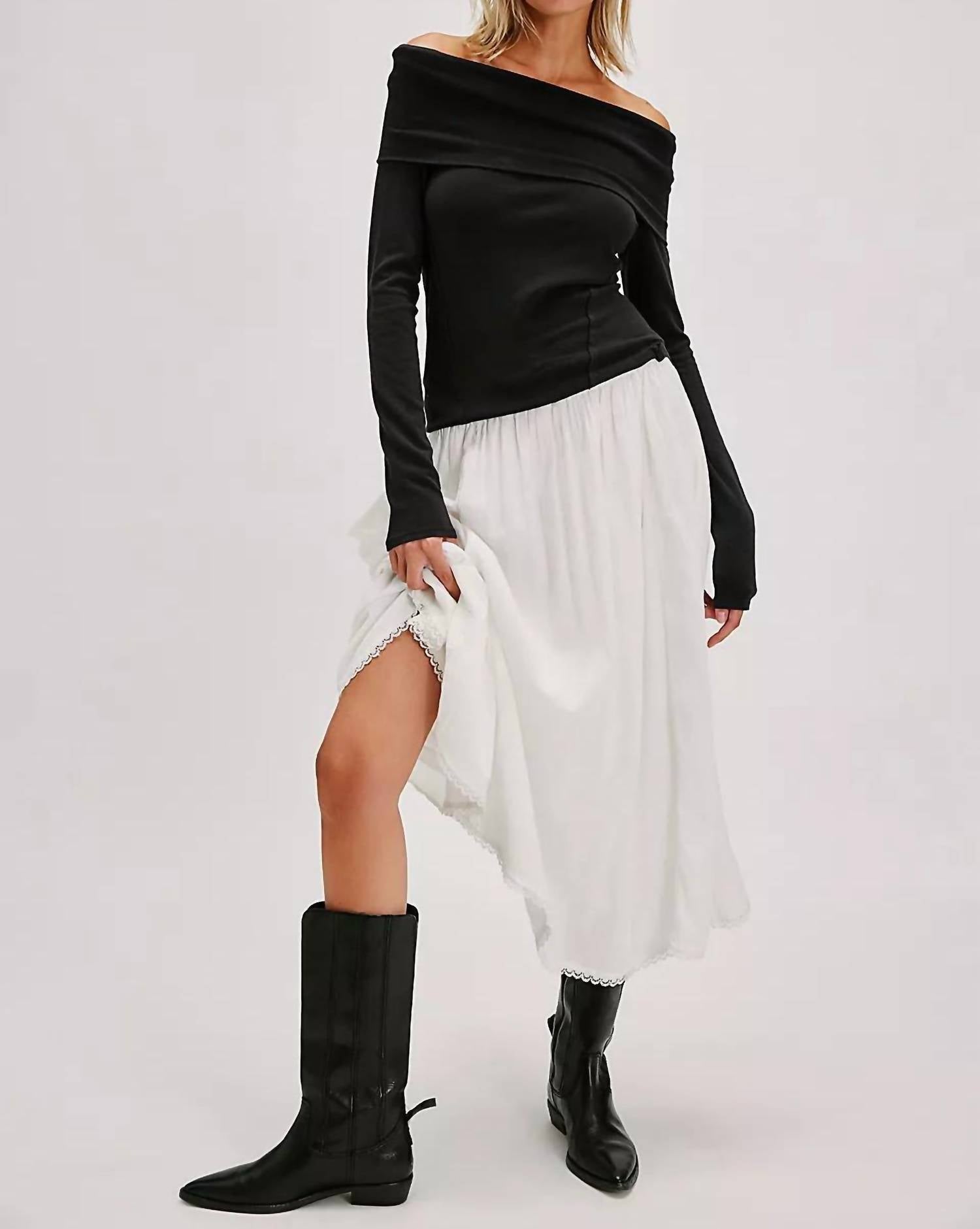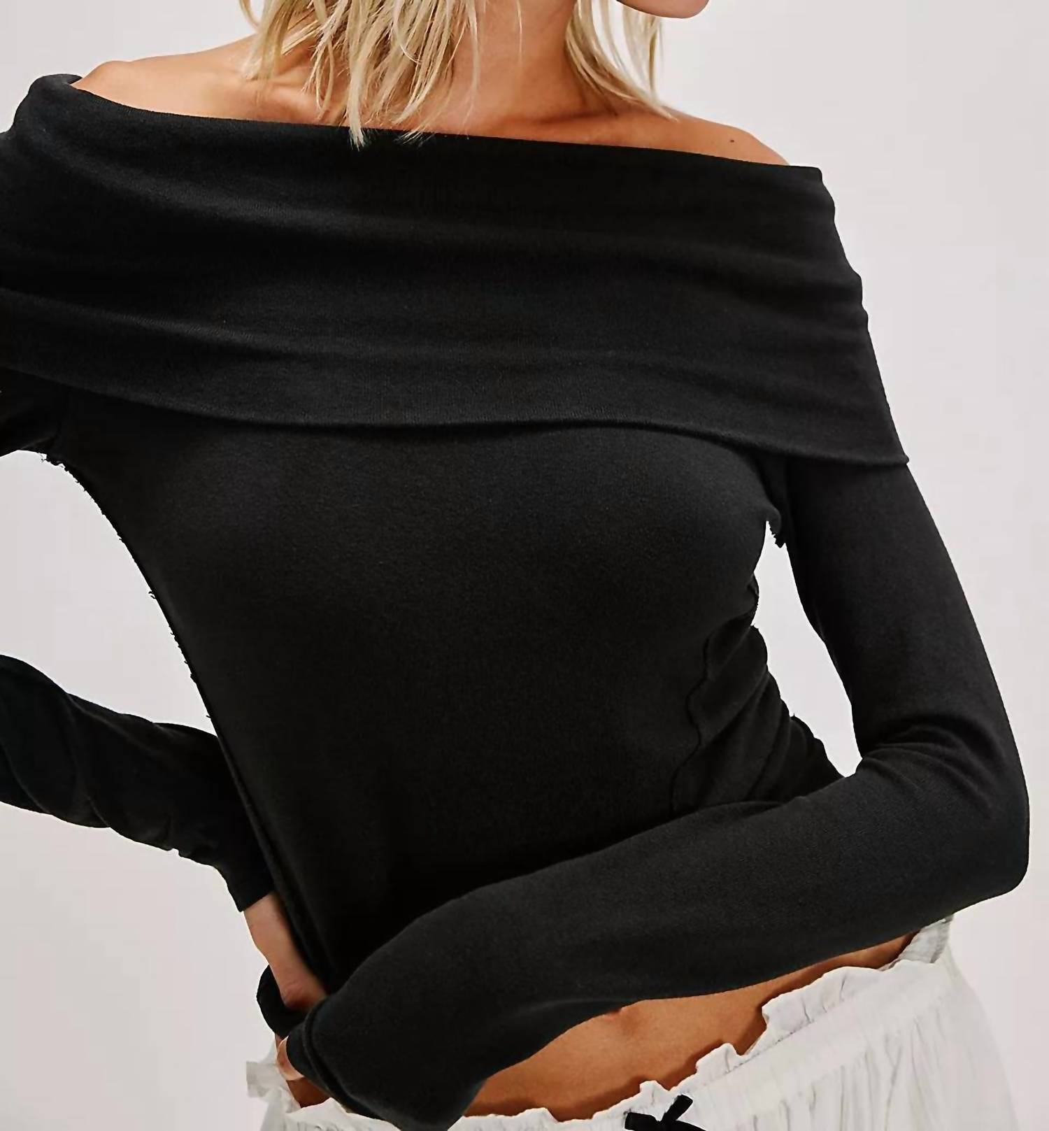 The perfect long sleeve tee that goes with just about anything. This women's top is crafted from a cotton blend featuring 94% cotton and 6% elastane, offering a slim, relaxed fit with striking off-the-shoulder and folded neckline details. Designed with long sleeves and exposed seam detailing, it can be layered effortlessly through all seasons. Closure: Pull-on. Care: Machine wash cold.