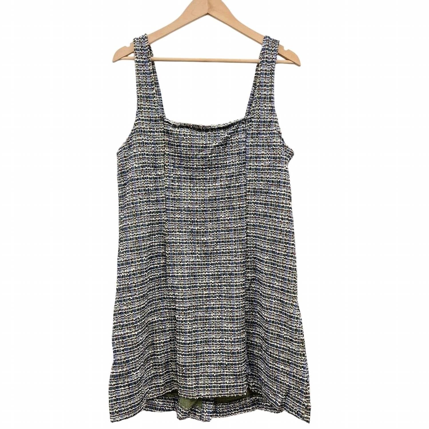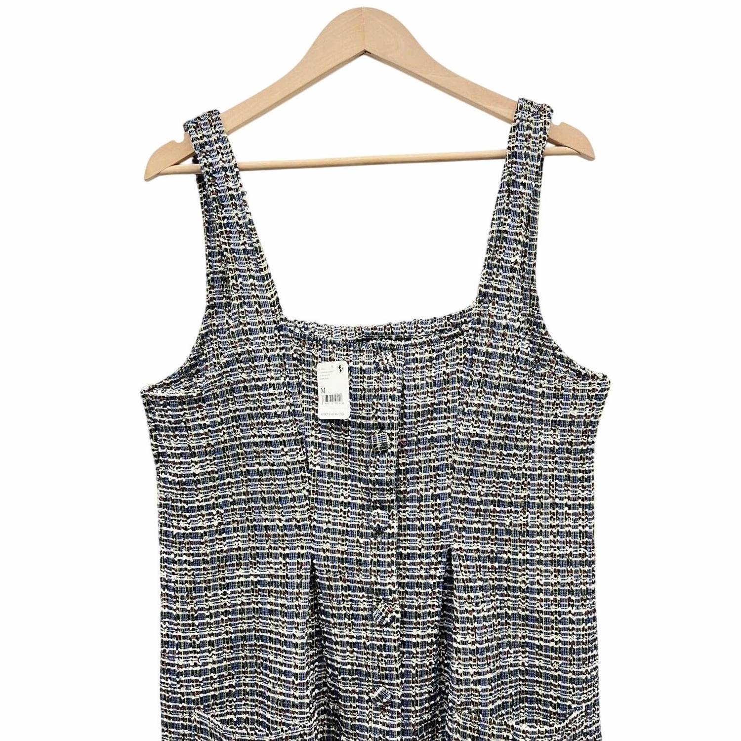 A short and breezy dress for those warmer days. Introducing the Free People Maxx Mini Shirt Dress in an alluring Midnight Combo, a must-have for any fashion-forward wardrobe. This sleeveless mini dress features a square neckline and an A-line silhouette, complemented by a button front closure. Made in Turkey from a premium blend of 72% polyester, 15% viscose, 8% acrylic, 4% cotton, and 1% elastane, it includes two front patch pockets for added functionality. Care for this piece is easy with machine wash instructions, making it effortlessly chic and practical. Approximate measurements are 35” length, 19” chest, and 17.5” waist.