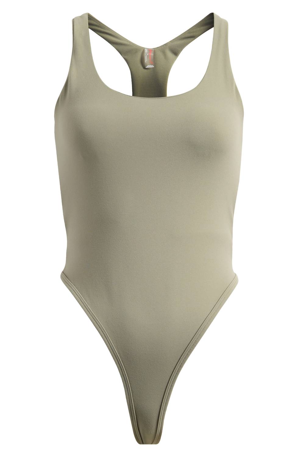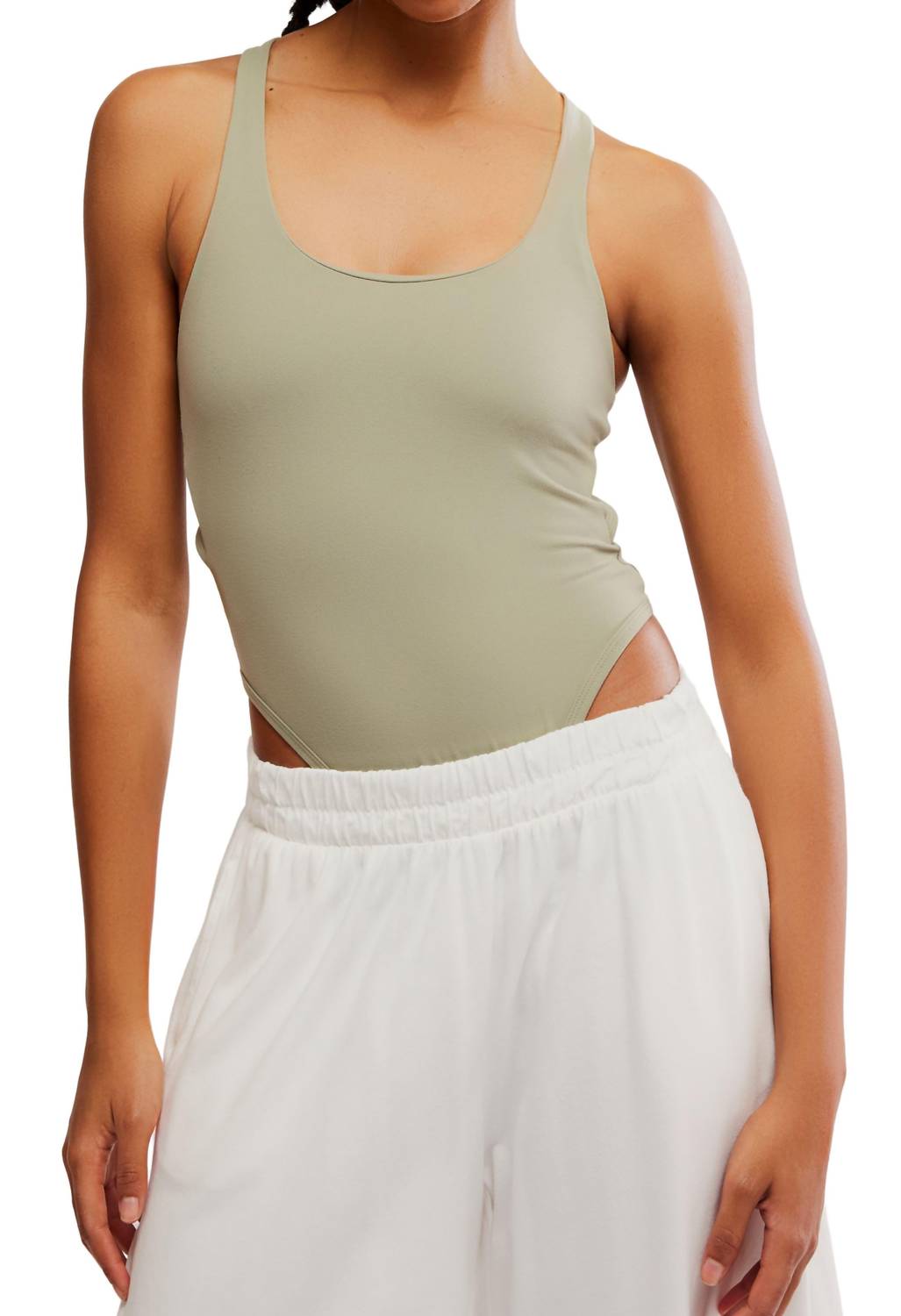 Form fitting and comfortable - this bodysuit check all of the boxes. Introducing the Never Better Bodysuit by Free People, a versatile activewear piece perfect for dance and yoga. This stylish bodysuit features a sleeveless design with a scoop neckline and high-cut legs, combined with strappy back detailing for a bold look. Crafted from 79% nylon and 21% elastane, it offers a soft, sweat-wicking experience. Closure Type: Pull-on. Care: Machine wash. Available in Sage Stone.