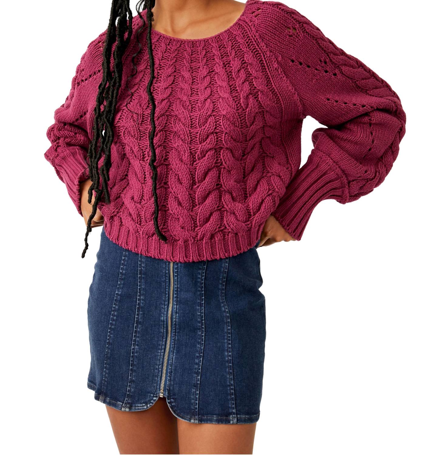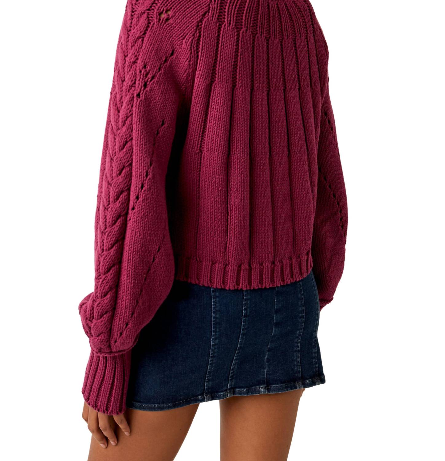 Experience the perfect blend of comfort and style with this trendy crew neck sweater, designed to effortlessly elevate your wardrobe. Pair it with your favorite denim and loafers for the perfect look. Introducing the Sandre Pullover by Free People in a dreamy mulberry hue. This women's long sleeve sweater, composed of a 60% cotton and 40% acrylic blend, offers a slouchy, slightly cropped fit with a 29-inch sleeve length and an 18.5-inch garment length. Designed with a crew neckline, it features cable knit and open knit detailing at the sleeves, alongside ribbed hems, completing a textured look. Closure: Pull on. Measurements for size small: 40-inch bust.