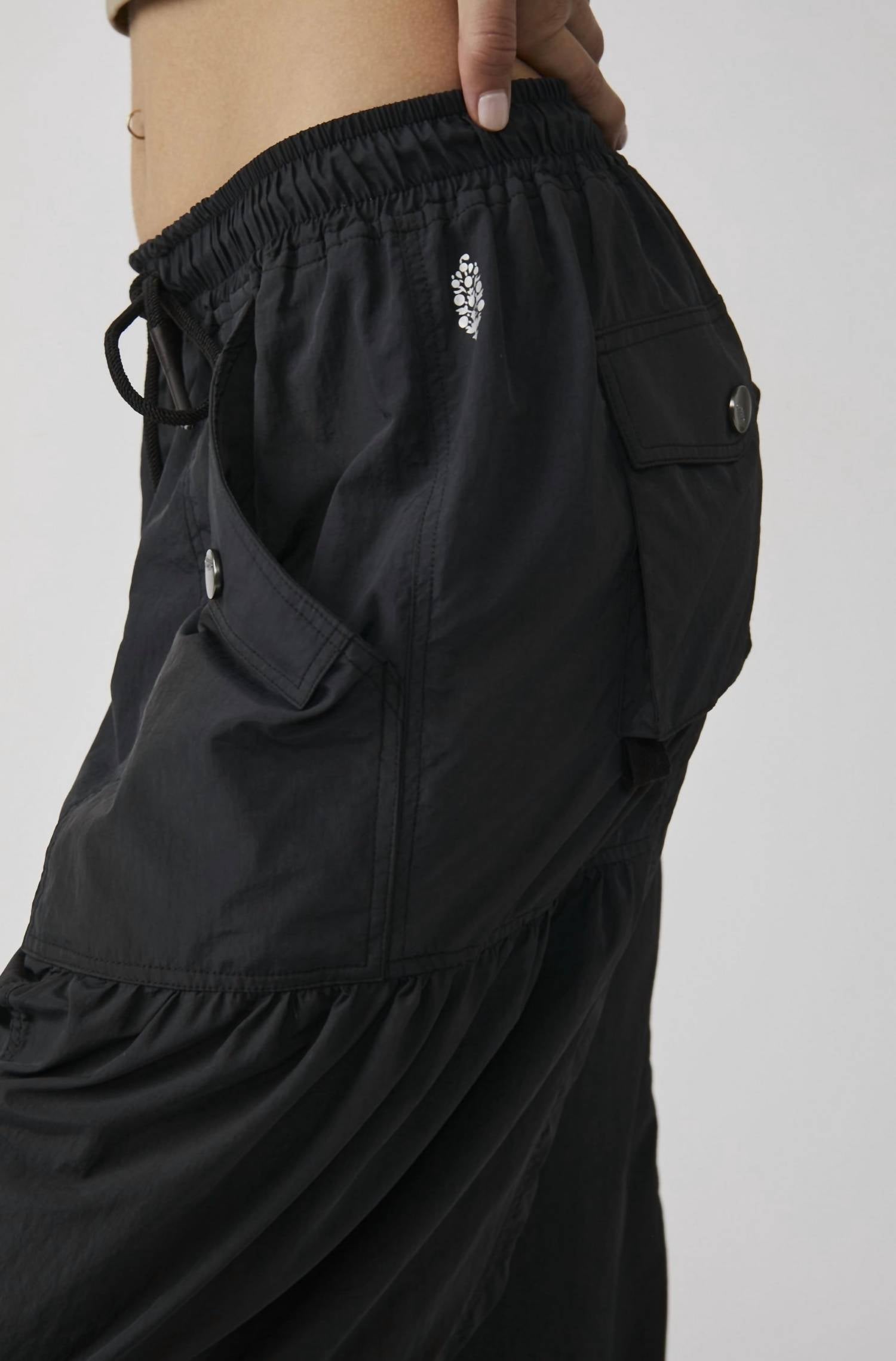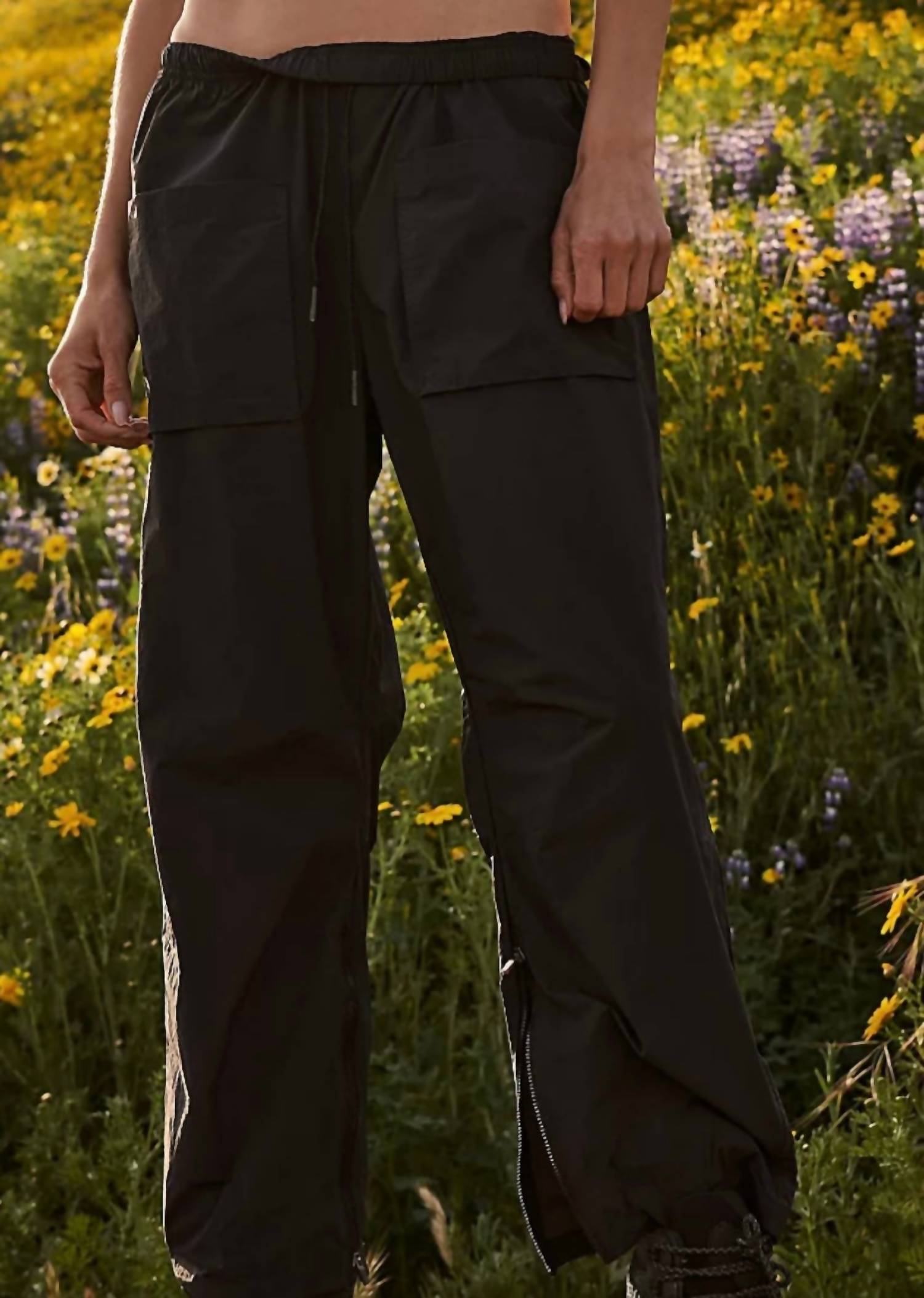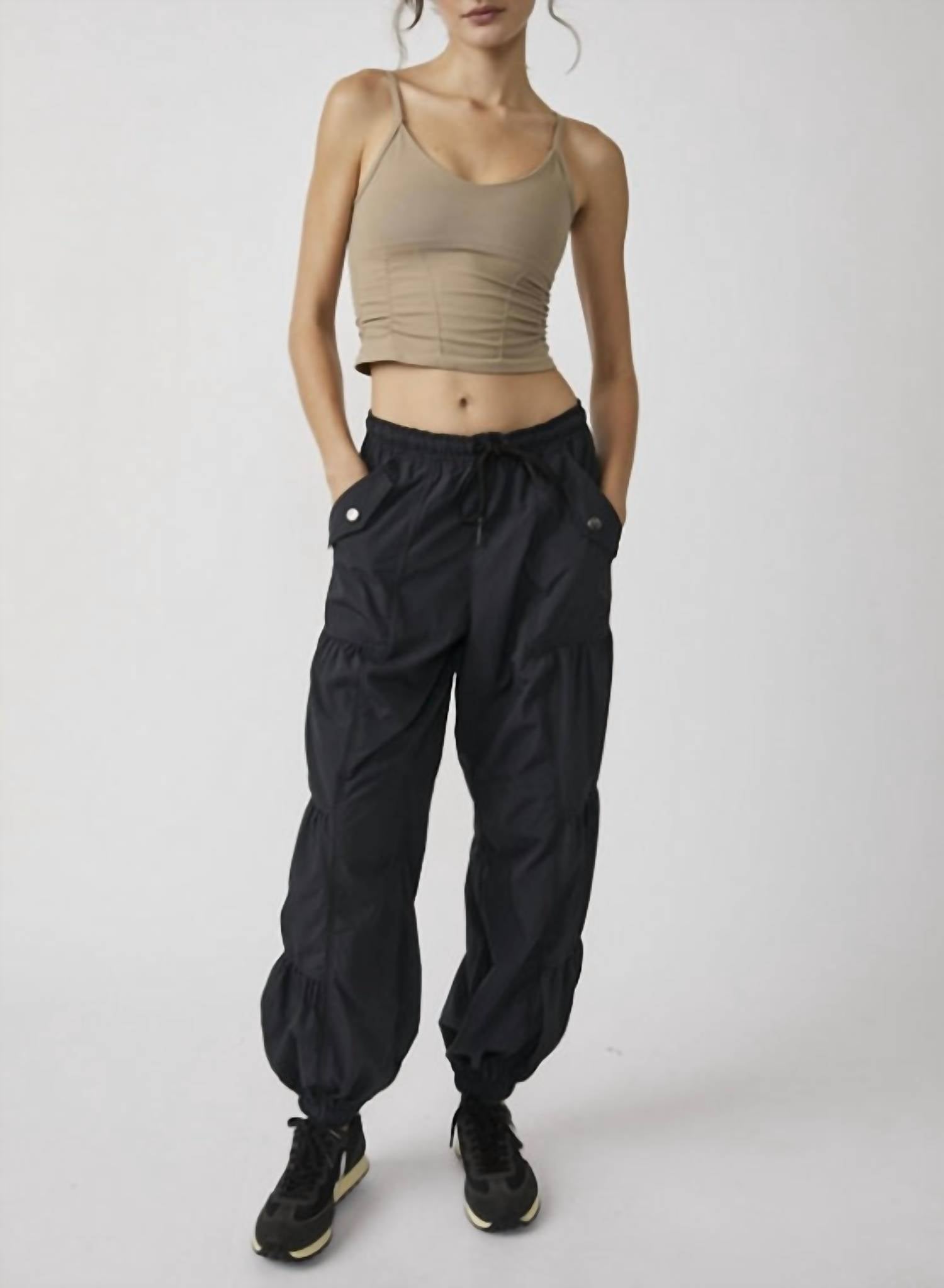 No gym necessary for these cool-girl joggers. Discover the functional and stylish Set Me Free Pants by Free People, perfect for your next hike. Featuring a relaxed, wide-leg fit with a mid-rise and ankle-length style, these pants are made from water-resistant nylon with shirred panels and elasticated cuffs for added comfort. The design includes a stretchy elastic waistband with an adjustable drawstring, while the semi-sheer fabric ensures breathability. Care is simple with machine wash cold, and these pants are imported. Measurements for size small: 28-inch inseam, 29.5-inch waist, 43-inch hips, and 11.5-inch rise.