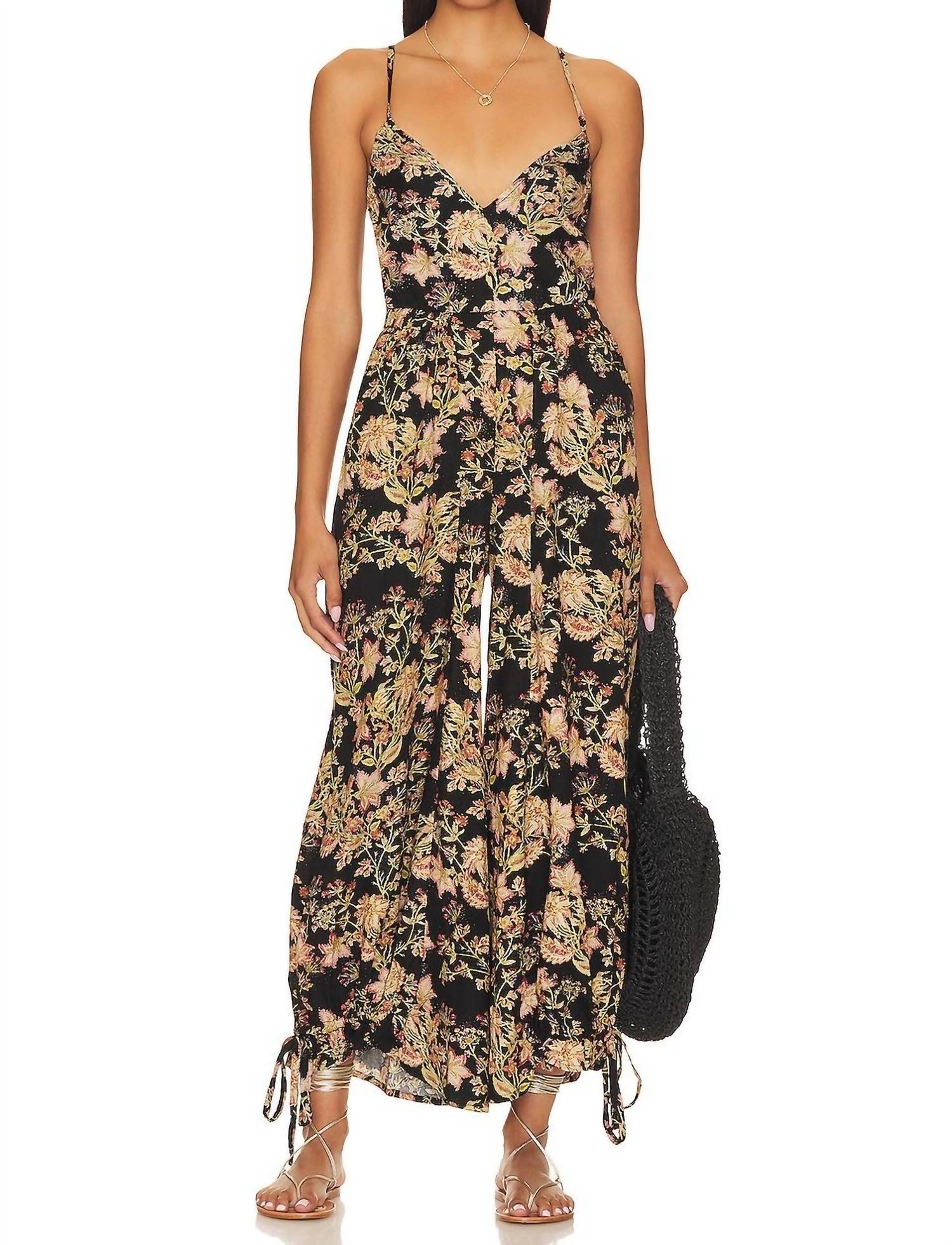 It doesn't take much for this one piece to look effortlessly cool. Add some statement jewelry to dress it up, or throw on some sneakers for a more casual vibe. This jumpsuit features an elastic waist with a back tie closure for a flattering fit. Crafted from a lightweight linen blend consisting of 47% rayon, 39% cotton, and 14% linen, it ensures comfort and breathability. The drawstring hem with a tie closure adds a stylish touch and allows for adjustable length. The model is 5'9" and is wearing size XS. For care, machine wash to maintain its quality. Made in India.