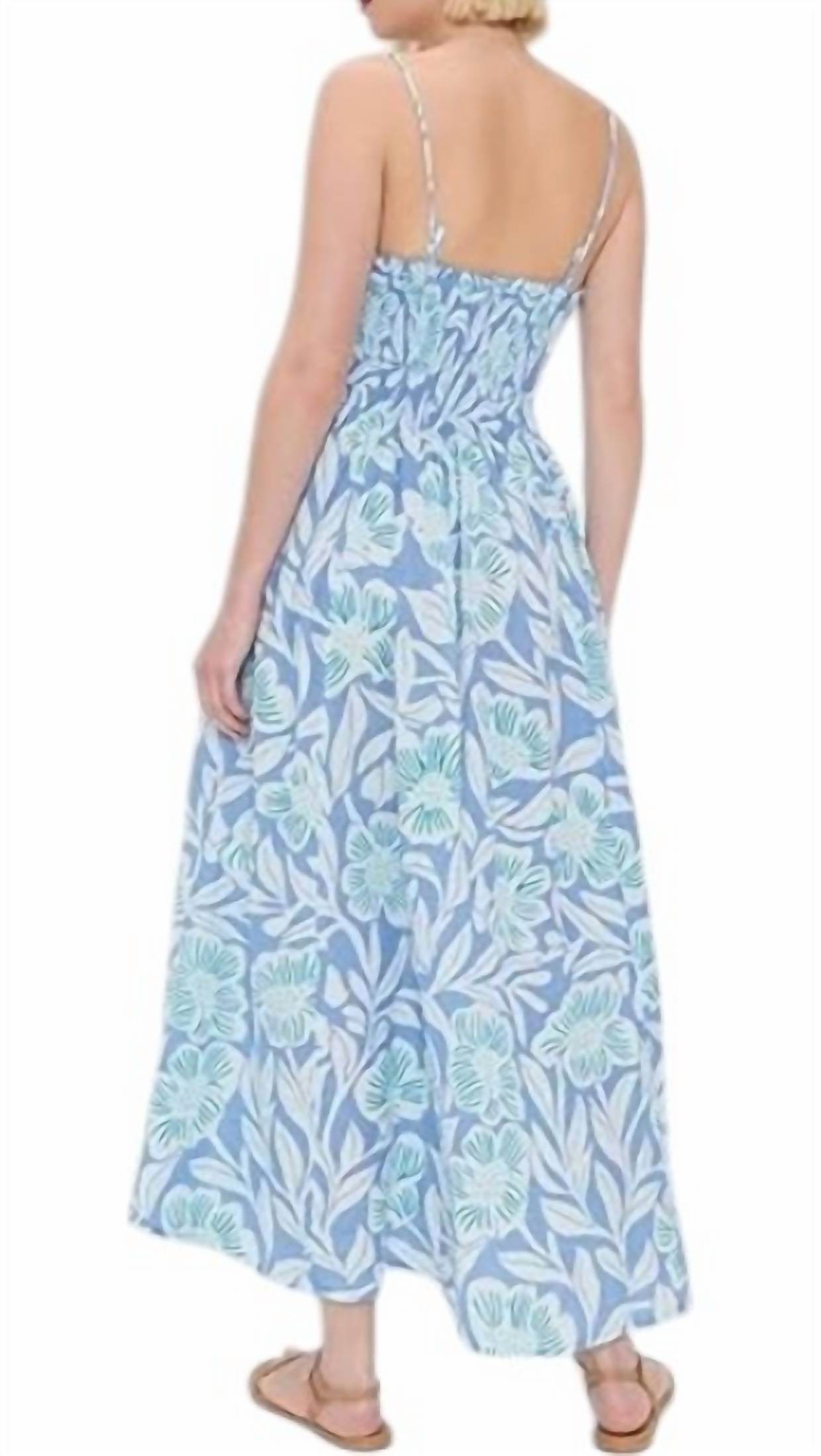 Just add slides or mules and you are good to go. Introducing the Sweet Nothings Midi by Free People, a versatile dress designed for style and comfort in a Blue Vista Combo. This women’s midi dress features a sleeveless silhouette with spaghetti straps and a soft smocked bodice, complemented by a scoop neckline with ruffle trim. Made from pure cotton, the dress showcases a beautiful patterned design and an A-line hem that can be dressed up or down. Care: Machine wash and lay flat to dry.