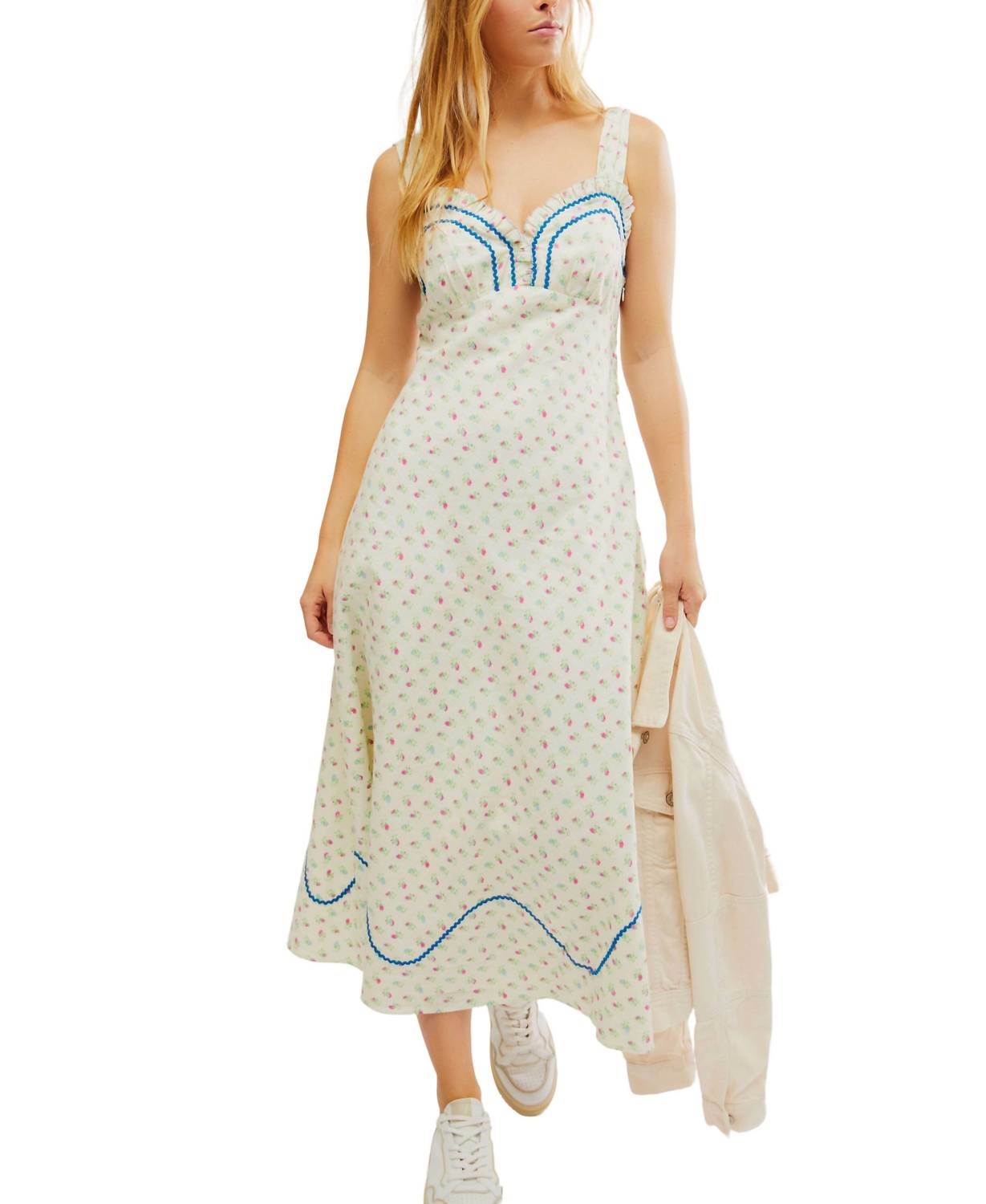 A midi dress so versatile, your options for wearing it are endless. Introducing the Ivory Combo Sweethearts Midi Dress by Free People, perfect for daytime occasions with its whimsical floral design. This sleeveless dress features a flattering fit-and-flare, A-line silhouette with a sweetheart neckline and charming ruffled trim. Crafted from soft cotton, it boasts a bow-tie back closure for added flair. Care instructions include machine wash cold, with an emphasis on easy maintenance.