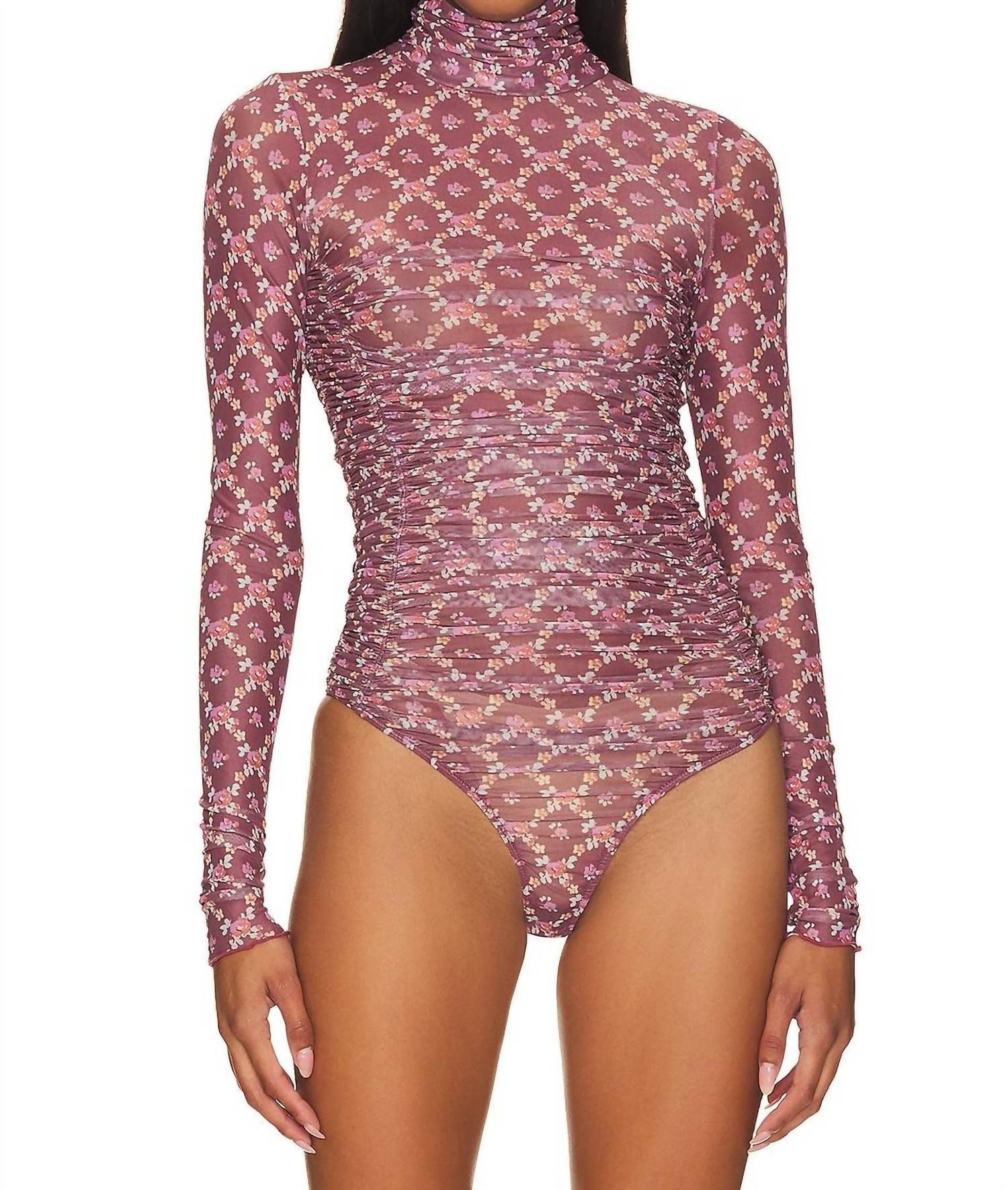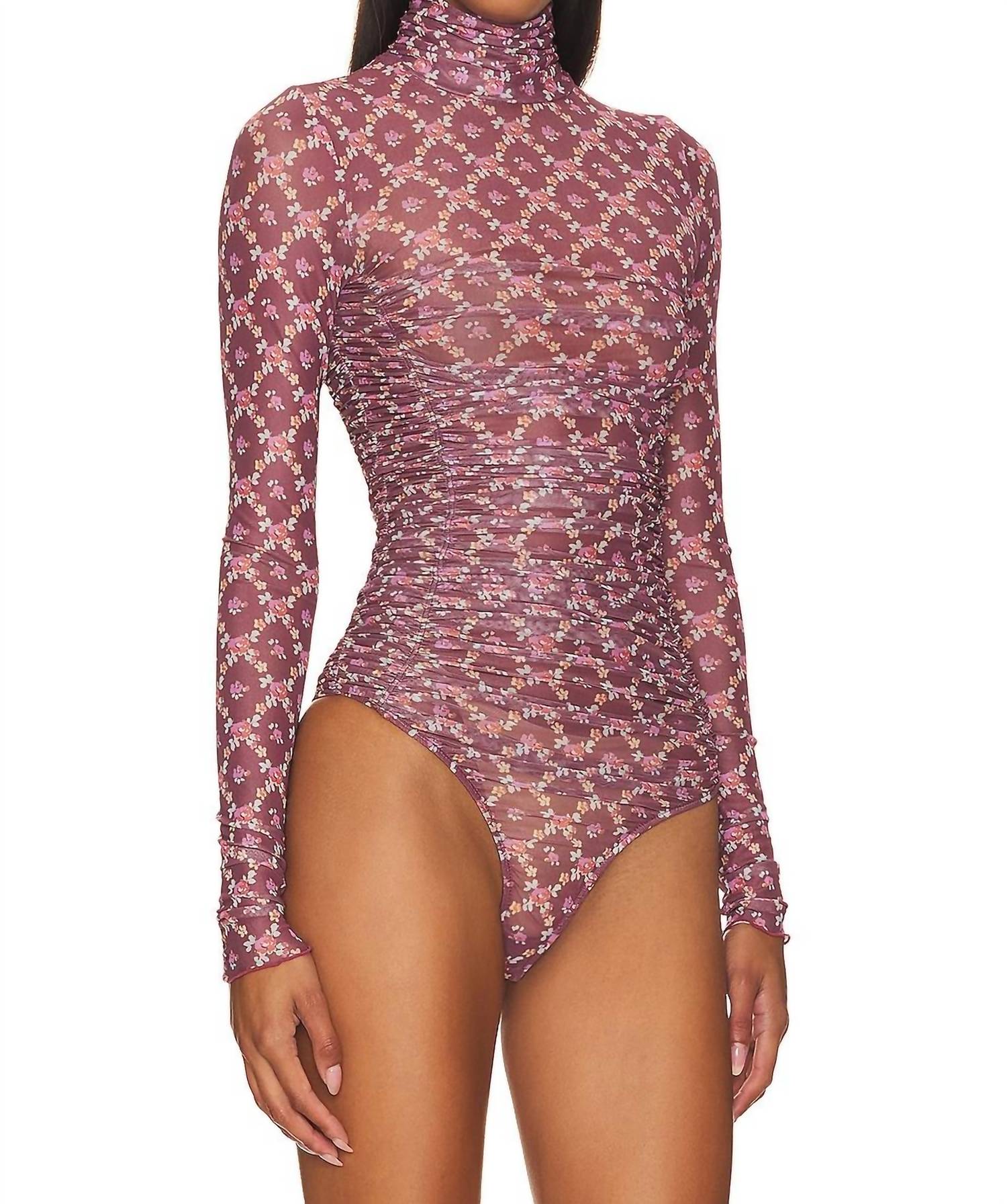 Discover the elegance of the Free People Under It All Bodysuit in a charming Garnet Combo floral pattern. This piece boasts long sleeves and a sophisticated turtleneck, featuring a sheer mesh composition with delicate ruched detailing. Closure: Snap closure with a thong back for comfort and allure. Care: Hand wash and lay flat to dry. Please note that the semi-sheer fabric may show undergarments.