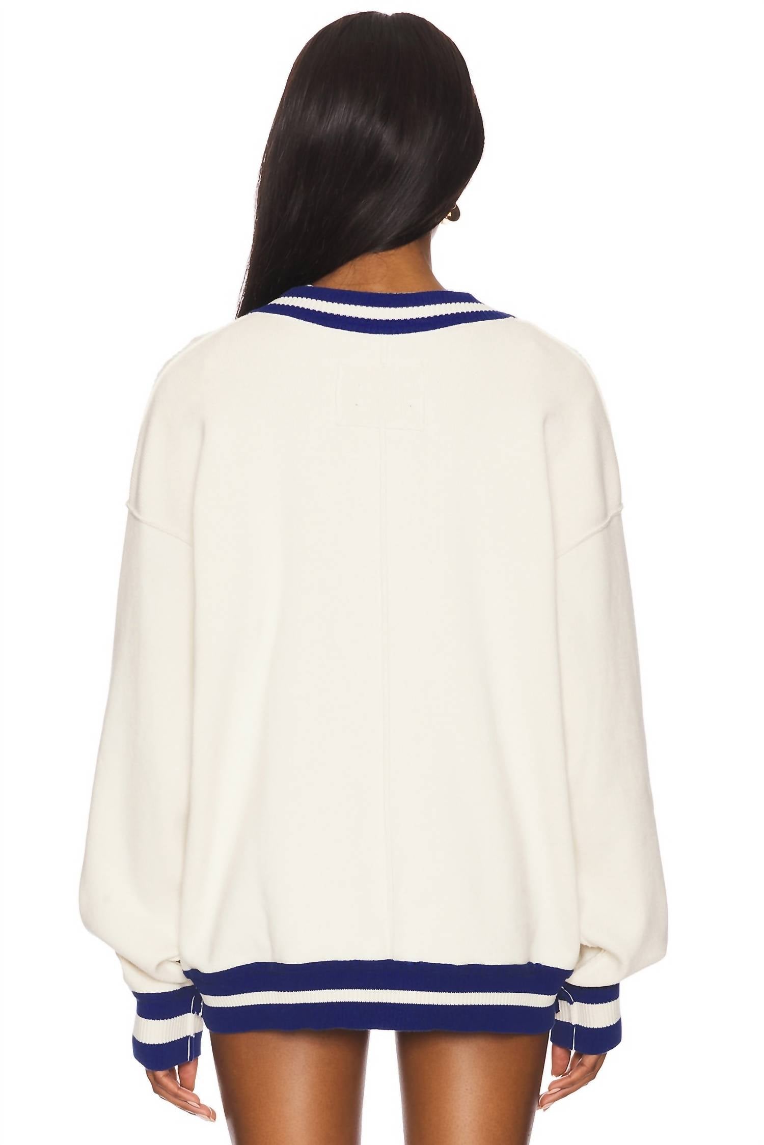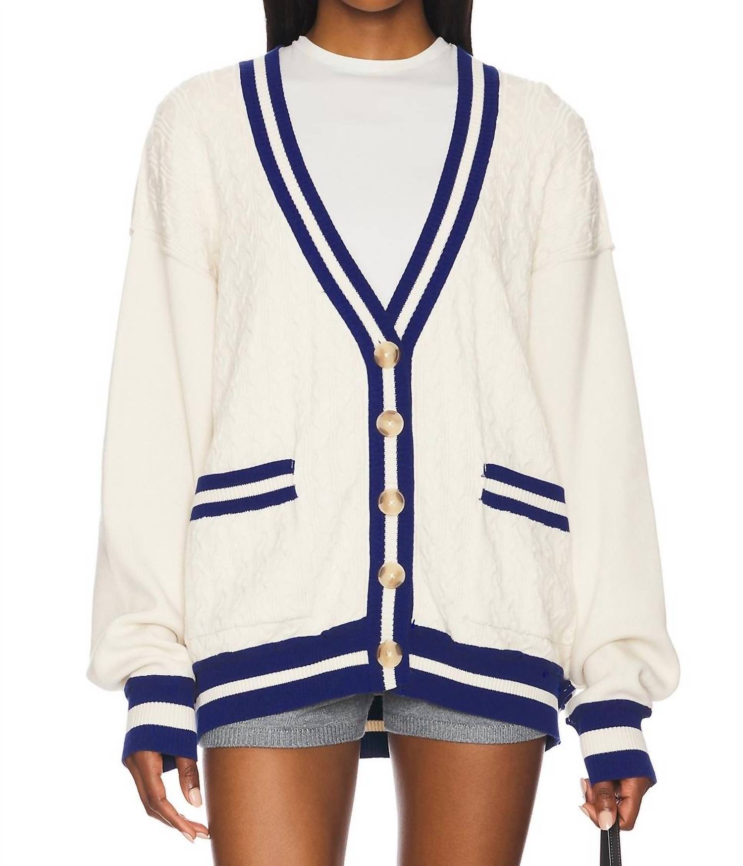Stylish ecru cardigan. Features long sleeves. Crafted from a midweight knit cotton, offering both comfort and flexibility. With a garment length of 27 inches. Includes front pockets and a button closure for convenience. Made in India. Easy to maintain with machine wash care instructions.