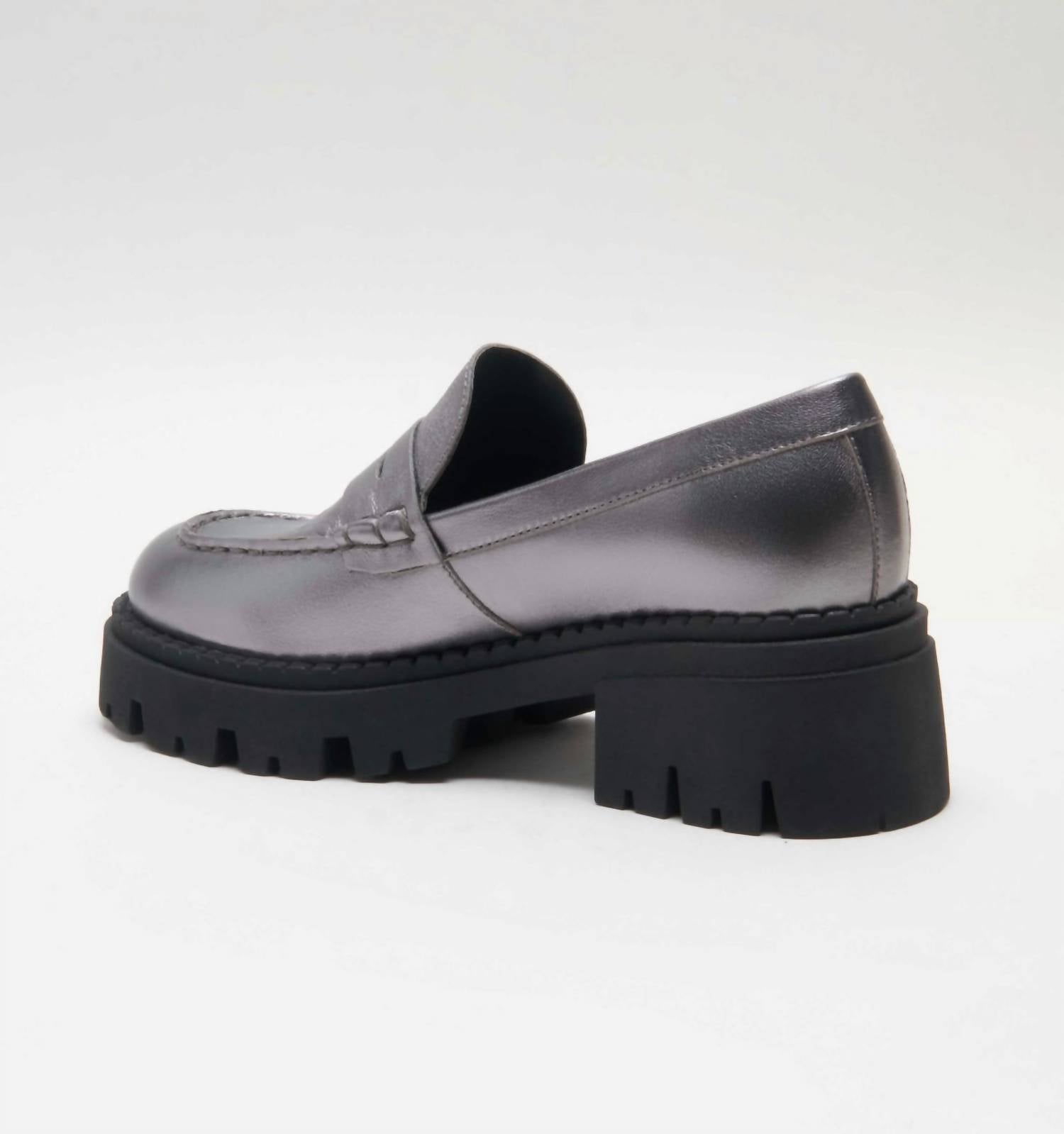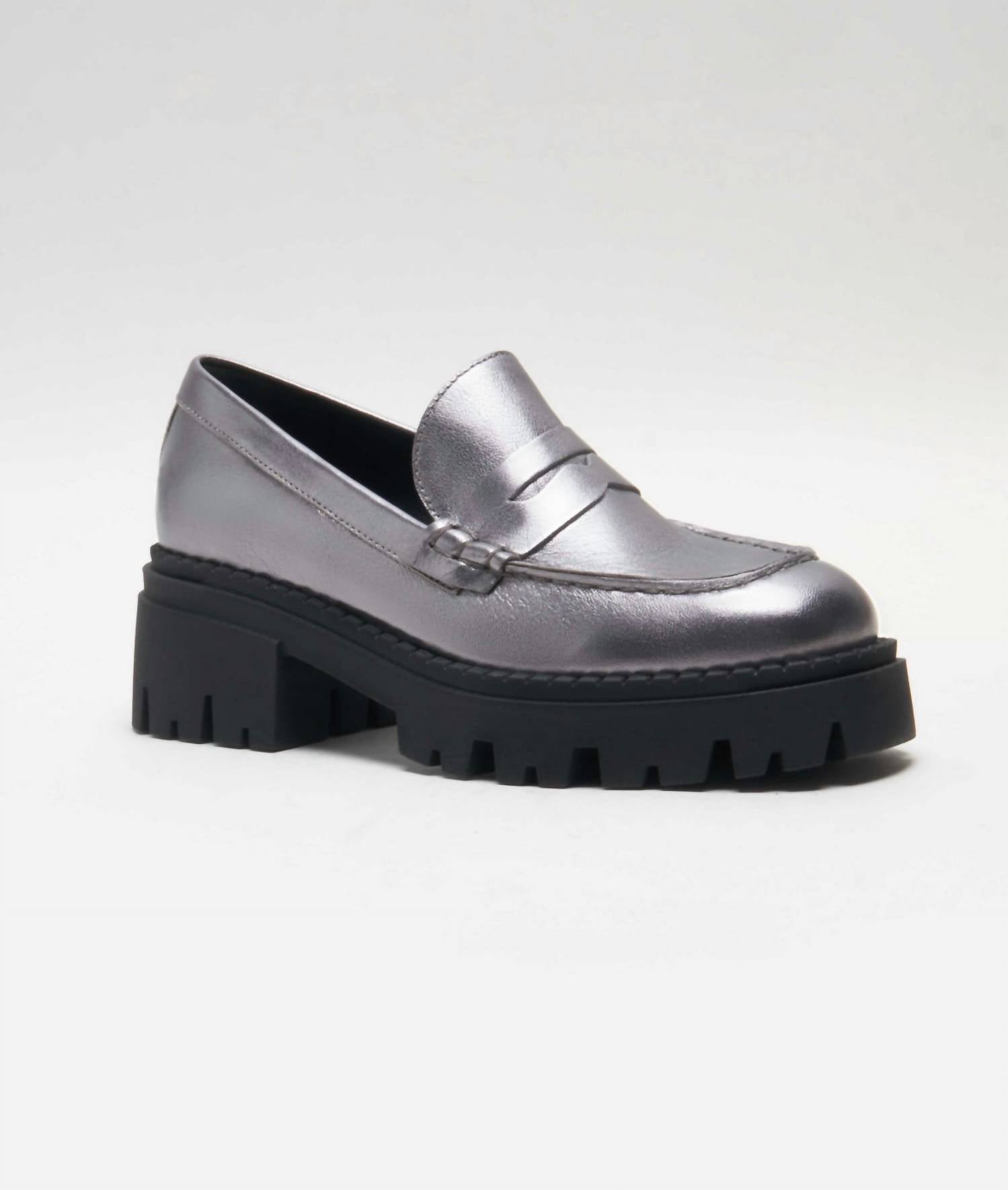 A preppy yet feminine take on the classic loafer. Discover the Free People Women's Lyra Lug Sole Loafer, crafted in iconic style with a smooth, buttery leather upper and rubber outsole. This loafer boasts a striking silver finish, complete with a round toe and block heel for added comfort. The eye-catching platform lugged sole brings a super cool edge to your ensemble. Embrace a timeless look with a modern twist, perfect for any occasion.