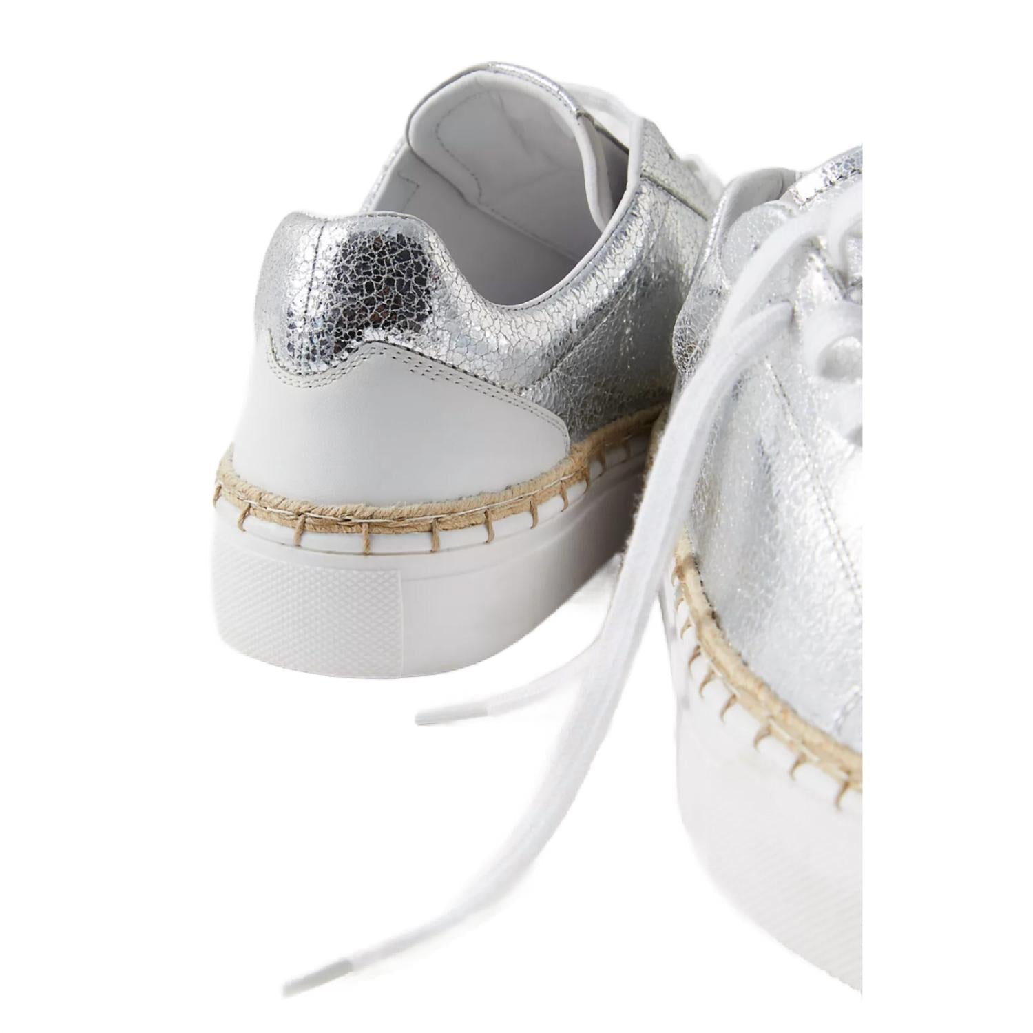 Cute, functional, and comfortable. These sneakers check all the boxes. Introducing the Women's Scotty Sneaker by Free People, a chic low-top court sneaker in sleek silver designed for versatile wear. Crafted with hand-finished leather uppers, these sneakers feature a contrast heel tab and espadrille-inspired stitching for a modern touch. They come with a rubber sole and secure with a lace-up closure, providing both style and comfort. Made in the imported style, these sneakers boast a 1-inch heel height and platform, making each step fashionable and effortless.