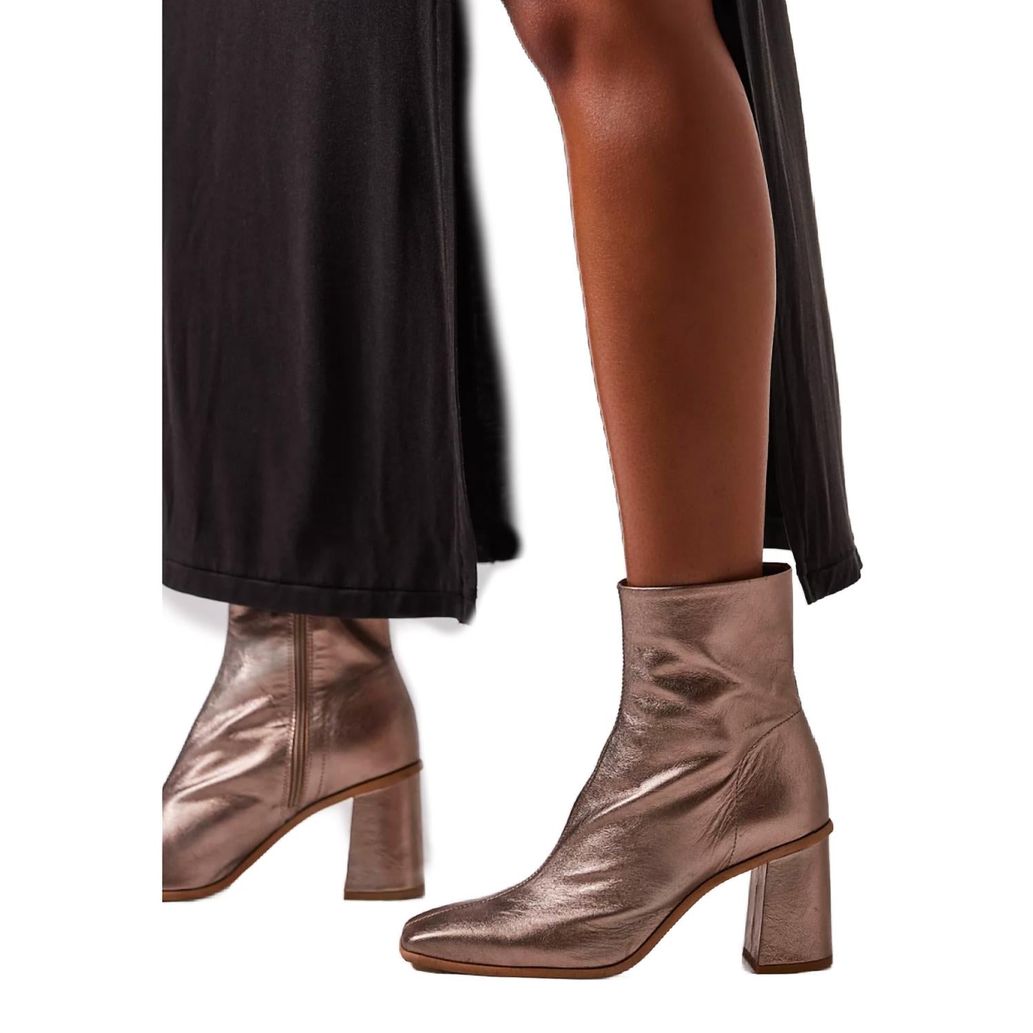 Say hello to the perfect, most versatile boot. The ankle height makes this style easily transition from day to night. Wear them with your favorite skinny jeans and tee for a more laid back look, or pair them with your favorite mini dress and jacket for a night out on the town. Introducing the Free People Women's Sienna Ankle Boot in a bold bronze hue, an essential for the effortlessly chic wardrobe. These ankle-length boots are expertly crafted in Portugal with a leather composition, offering a slip-on style enhanced by a side zipper closure. Designed with a tall 3" block heel and a squared-off toe, they provide both style and comfort with a leather footbed and lining. Perfect for adding an edge to any outfit, these boots demand attention as they transition from day to night effortlessly.