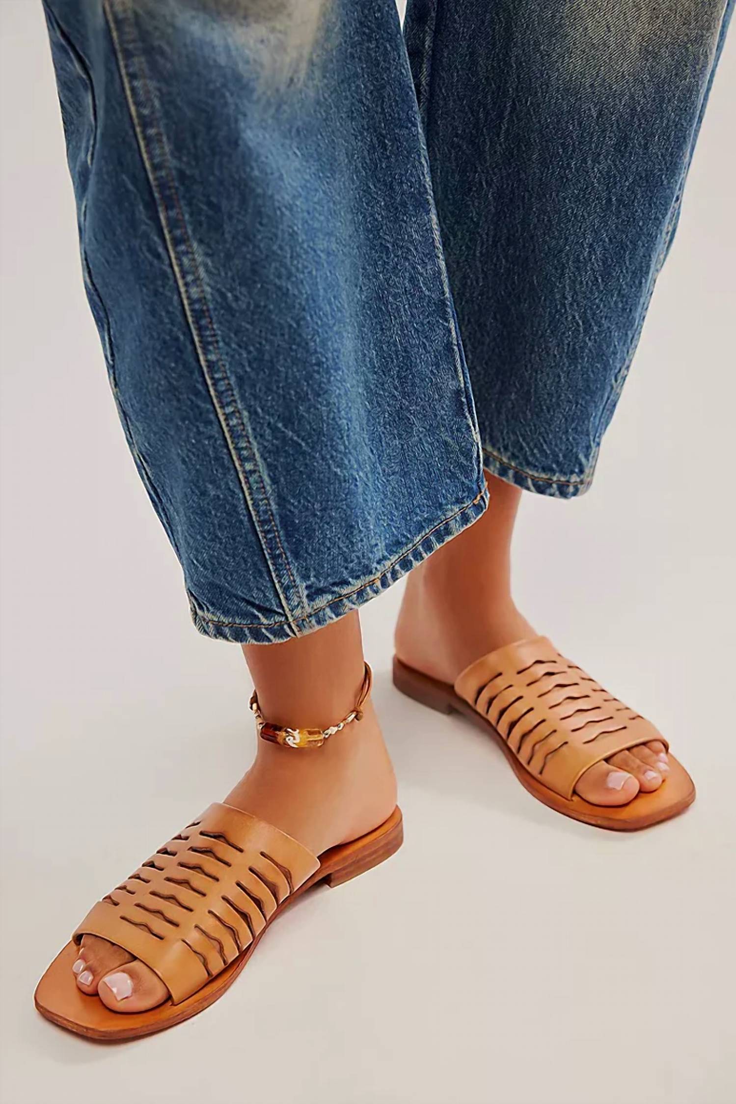 Classicly cute and all-day-wearable. We love this sandal. Discover the Women's Slice Of Sun Sandal by Free People, a stylish addition to your summer wardrobe. Featuring a thick, sliced toe strap for texture, these sandals boast a breezy, slip-on, backless design. Made from premium leather in a vachetta hue, they showcase a square open toe with a flat sole and mini heel for comfort. Ideal for laid-back elegance, these sandals promise effortless style and comfort.