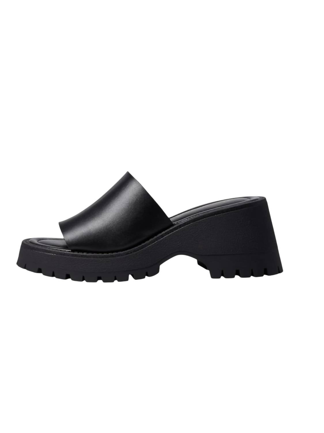 Leather upper. Synthetic lining. Cushioned synthetic footbed. Easy slip-on style. Rounded open toe. Chunky, wedge-inspired heel. Treaded synthetic outsole. Made in Italy.
