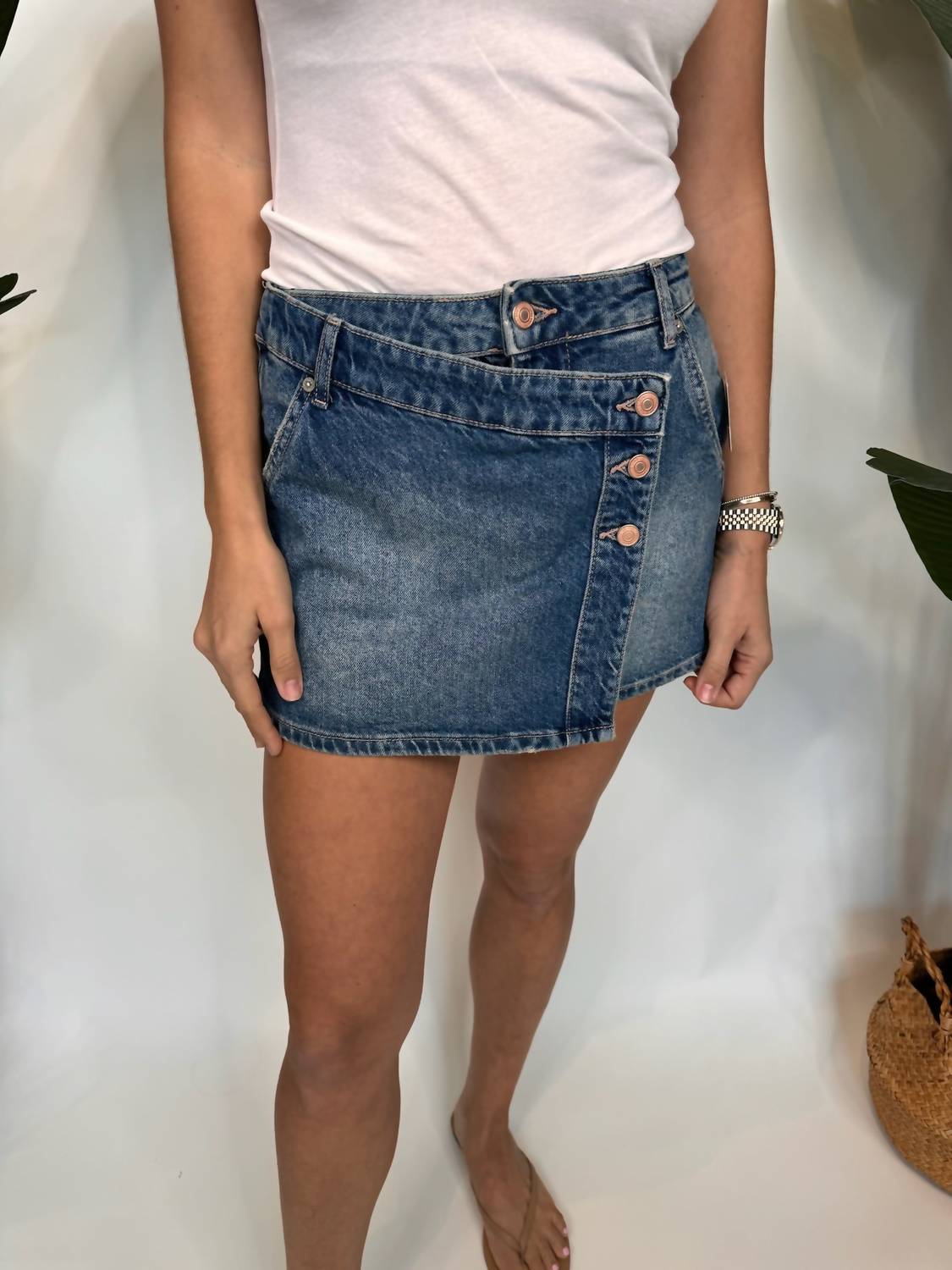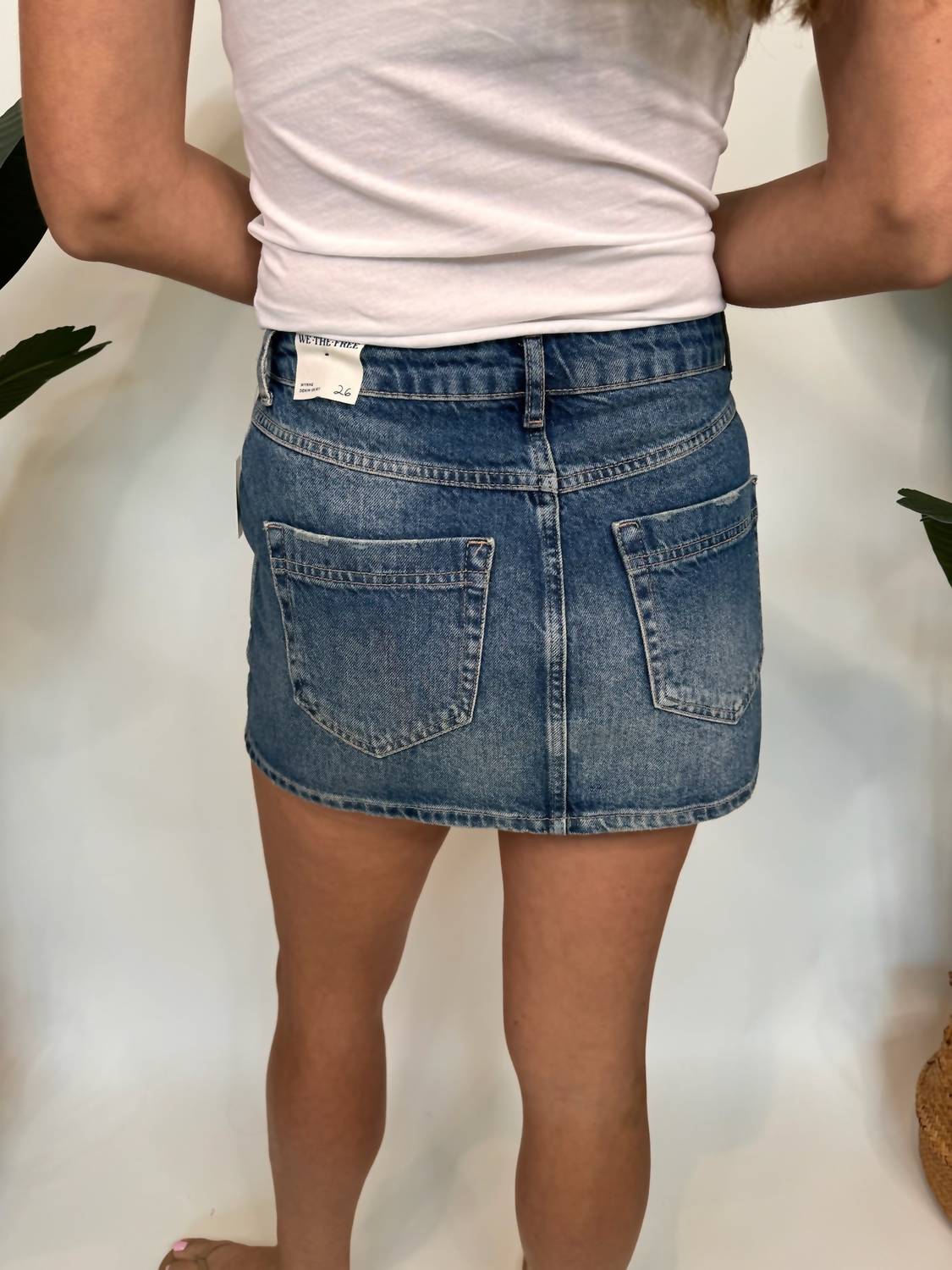 Tuck in your favorite tee for a more laid-back vibe. Elevate your look with the Free People Wynne Denim Skirt, a playful and chic essential in a flattering cornflower hue. This mini skirt features a mid-rise design with an asymmetrical wrap silhouette and practical side button closure. Made from 100% cotton, it ensures comfort and style, complete with pockets for added convenience. Care for this piece effortlessly with machine wash in cold water and tumble dry on low settings. Alyssa is 5'10" and is wearing a size 26.