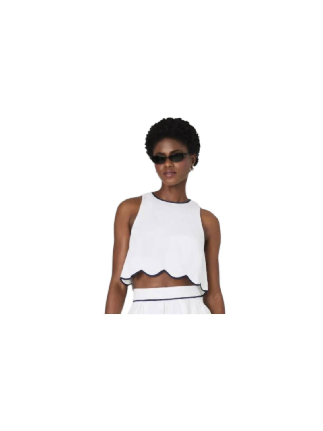 A versatile blouse that works from desk to dinner! Embrace warm weather with the Alexis Cotton Scallop Top by FRENCH CONNECTION, a must-have for stylish summer outings. This sleeveless blouse is crafted from a smooth cotton blend, boasting a contrasting piped scallop hem that adds a touch of elegance to its A-line shape. Its pull-on closure and back neck button fastening with keyhole detailing offer both convenience and style. Perfect for pairing with the Alexis Cotton Scallop Midi Skirt for a chic, coordinated look.