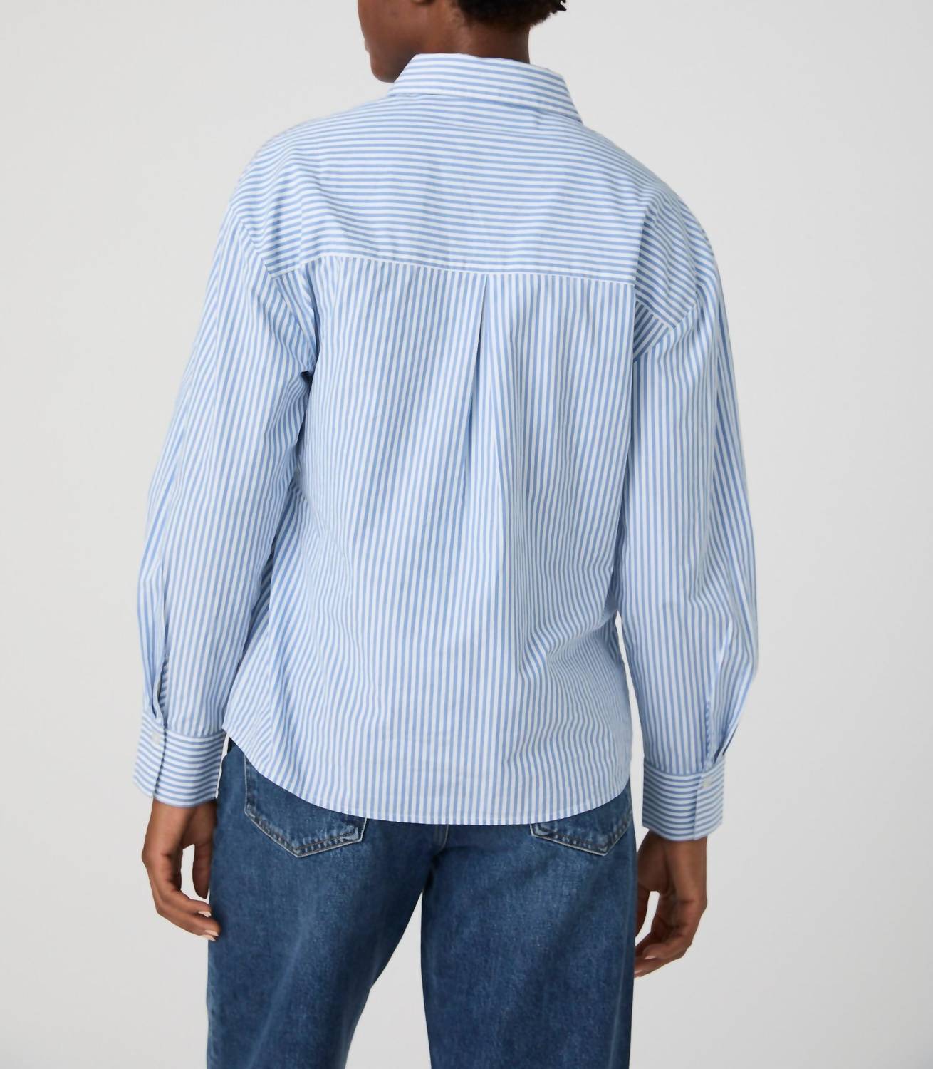 A versatile blouse that works from desk to dinner! Elevate your shirting collection with the Cambria Rosette Top by FRENCH CONNECTION, a charming piece in blue and white stripe print. This women's blouse features long sleeves with buttoned cuffs and a classic collar for a timeless look. It is composed of soft cotton, offering comfort and style with its button-through closure and asymmetric layer adorned with a corsage and self-tie fastening. Perfect for those who appreciate unique detailing in a classic shirt design, this top seamlessly blends elegance with everyday wear.