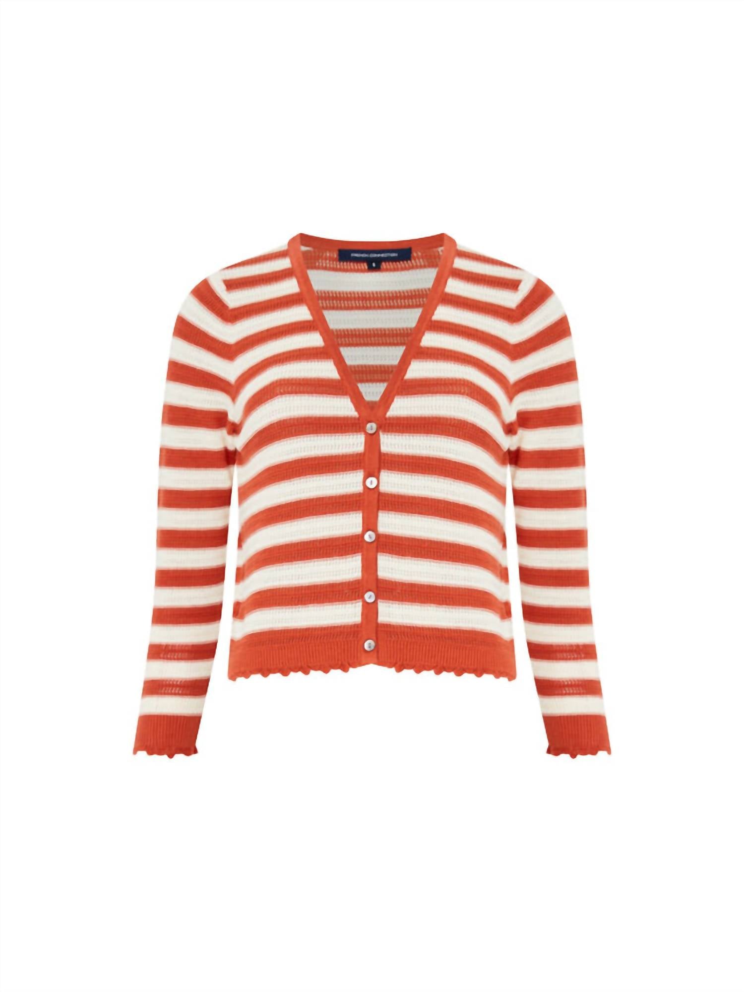 Introducing the Nesta Stripe Cardigan by FRENCH CONNECTION, a vibrant piece perfect for summer evenings. This cardigan highlights a long sleeve silhouette accented with classic stripes in uplifting shades, crafted from soft cotton. It features a charming v-neckline and sweet lettuce edges, secured with a button closure. Designed for easy maintenance, it is machine washable, ensuring this Rosewood/cream cardigan remains a staple in your wardrobe.
