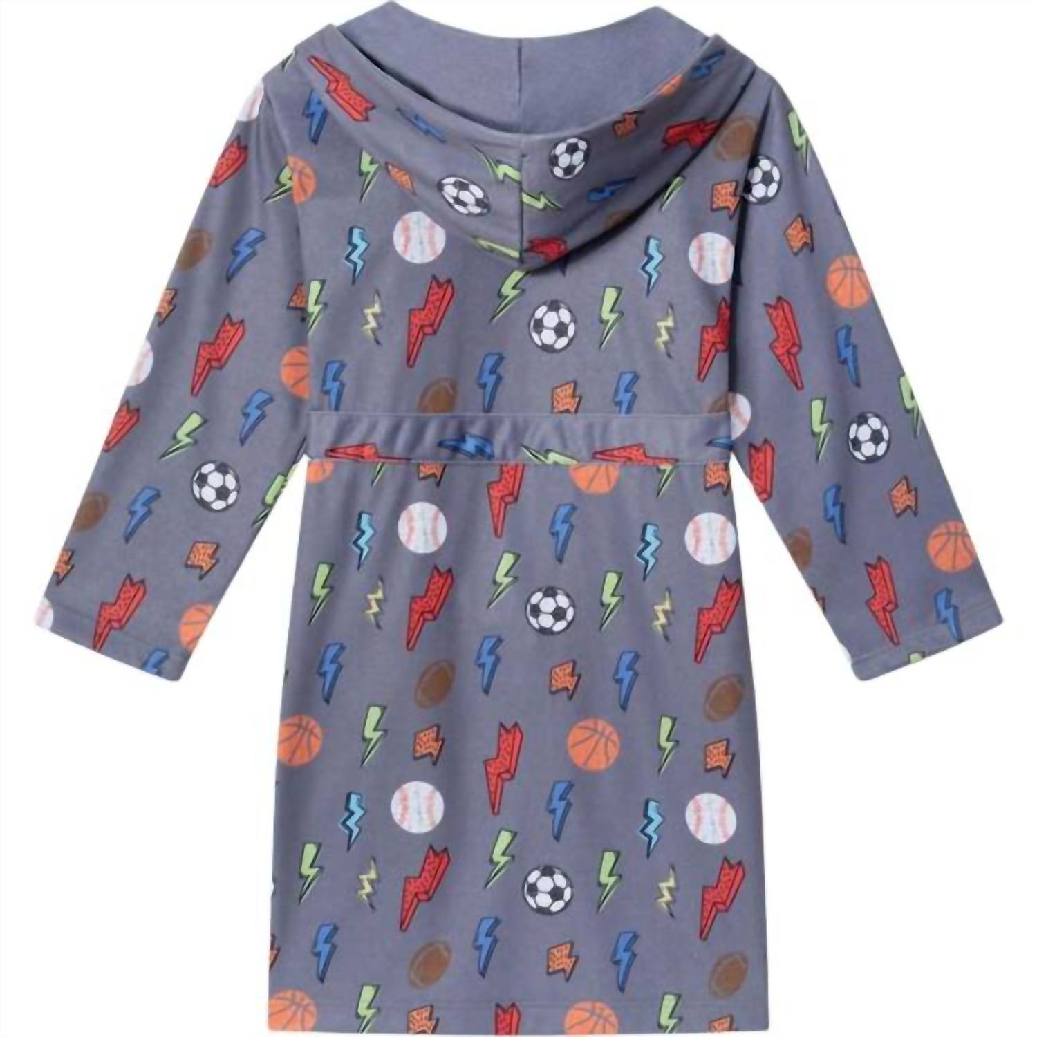 Bring a touch of sporty excitement to your child's loungewear with the Andy & Evan Boy's Sports & Lightning Bolts Jersey Knit Robe in Grey. Crafted from 100% Polyester, this robe features a playful pattern that's perfect for vacations or summer lounging. Its hood and waist tie ensure a snug, cozy fit, making it an ideal choice for after-bath time or lazy mornings. Care: Machine wash cold, do not bleach, tumble dry medium, cool iron from inside if needed, do not dry clean. Country of Origin: China.