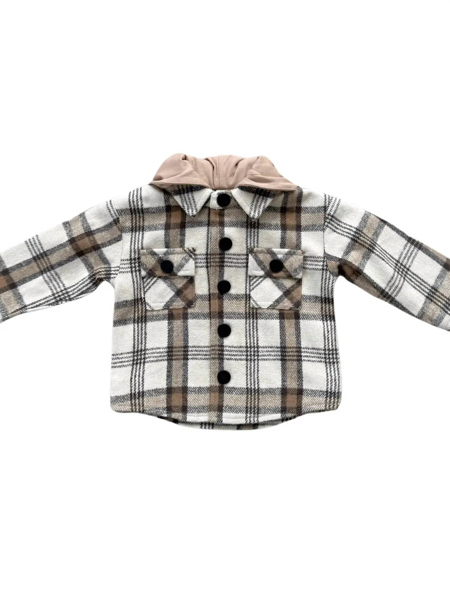 Introducing the Desert Plaid Boy's Hooded Shacket by Babysprouts, a stylish nod to 90s fashion. With long sleeves and crafted in soft brushed fabric, this piece is lightweight yet warm, perfect for layering. Featuring a functional button front and attached hood, it's a versatile addition to any fall wardrobe. Ideal for school days or family outings, this shacket beautifully combines the comfort and style your little one deserves.