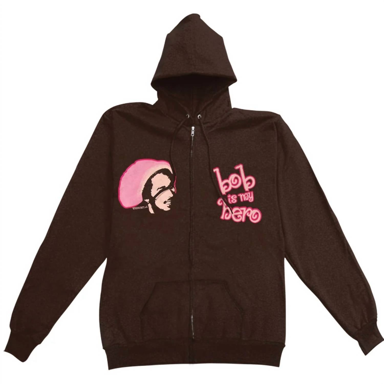 Celebrate your love for music and streetwear with the Teen's My Hero Juniors Zip Hoodie by Bob Marley. This brown hoodie features full-length sleeves, composed entirely of cotton for ultimate comfort. Adorned with a hot pink graphic of Bob Marley and the phrase "Bob is my Hero," it offers a stylish nod to a musical icon. Closure: Full zip. Care: Machine wash, tumble dry, perfect for spring music festivals or showcasing your style during the 4th of July.