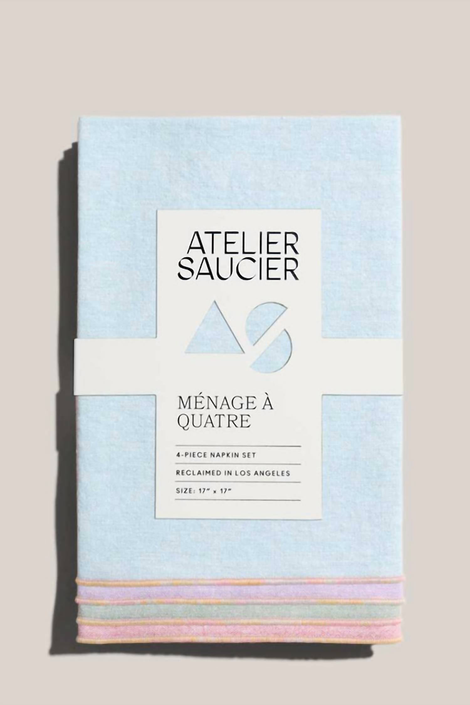 Enhance your dining experience with the Hummingbird Cotton Napkins by Atelier Saucier, a vibrant set inspired by the enchanting colors of a jungle sunrise. Each napkin in this four-piece set measures 17" x 17" and is crafted from 100% reclaimed fabric, showcasing mermaid blue, cactus flower purple, spearmint green, and dragon fruit pink hues. Proudly made in the USA, these napkins are perfect for adding a touch of whimsy to your table. Care instructions: Machine wash and tumble dry for easy maintenance.